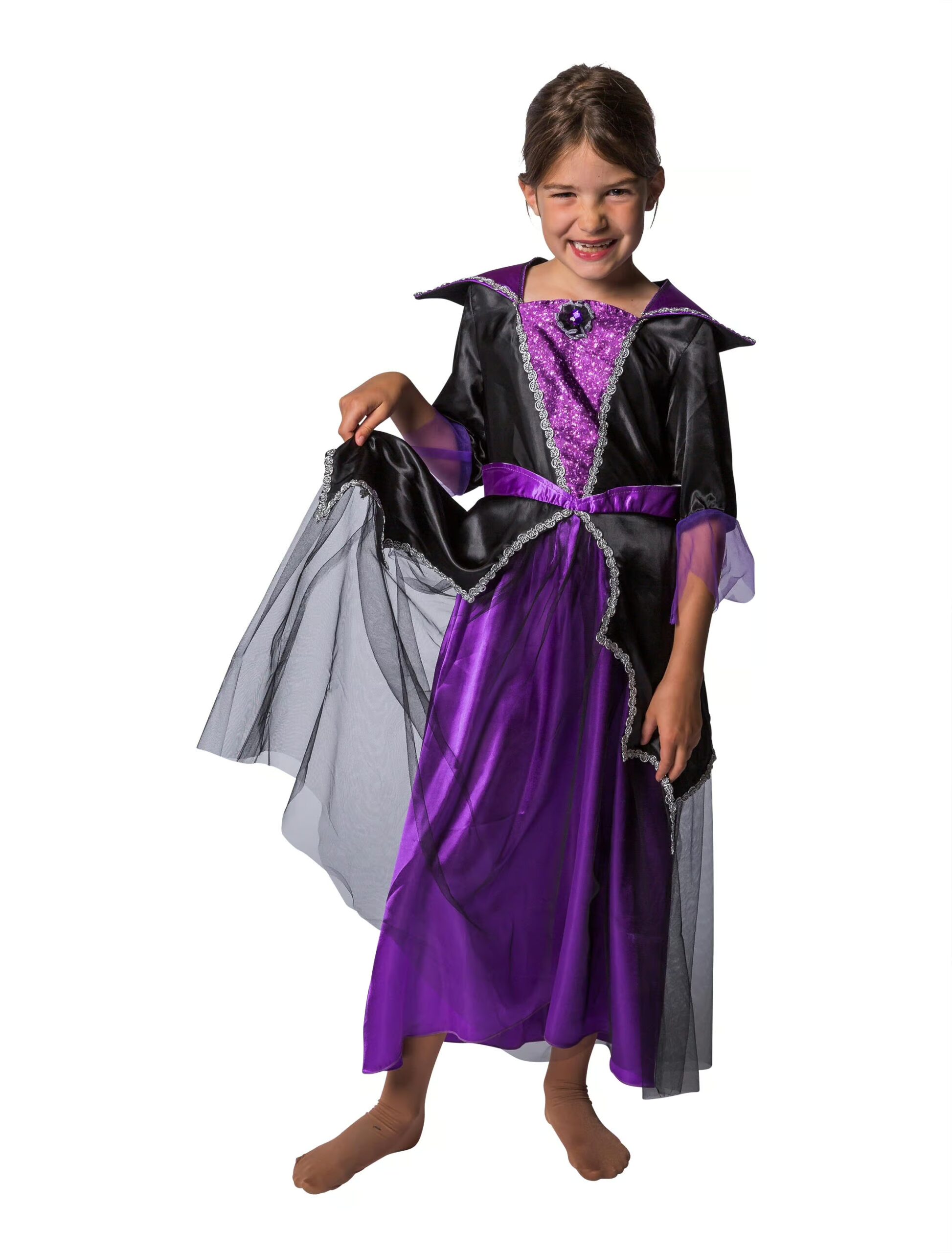 Ihr seid zu einer Halloweenparty eingeladen und sucht noch eine schaurige Verkleidung für Eure Tochter? Gar kein Problem! Unser Vampir Kleid für Kinder in Lila darf hier nicht fehlen. Der Stehkragen wird mit Hilfe von Klettverschlüssen verschlossen. Ein schönes gruseliges Kinderkostüm für die nächste Halloweenparty. Das Kleid ist aus 100% Polyester gefertigt. Das Produkt beinhaltet nur ein Kleid. Fehlen nur noch Vampirzähne, eine Halskette und eine schicke Kopfbedeckung.