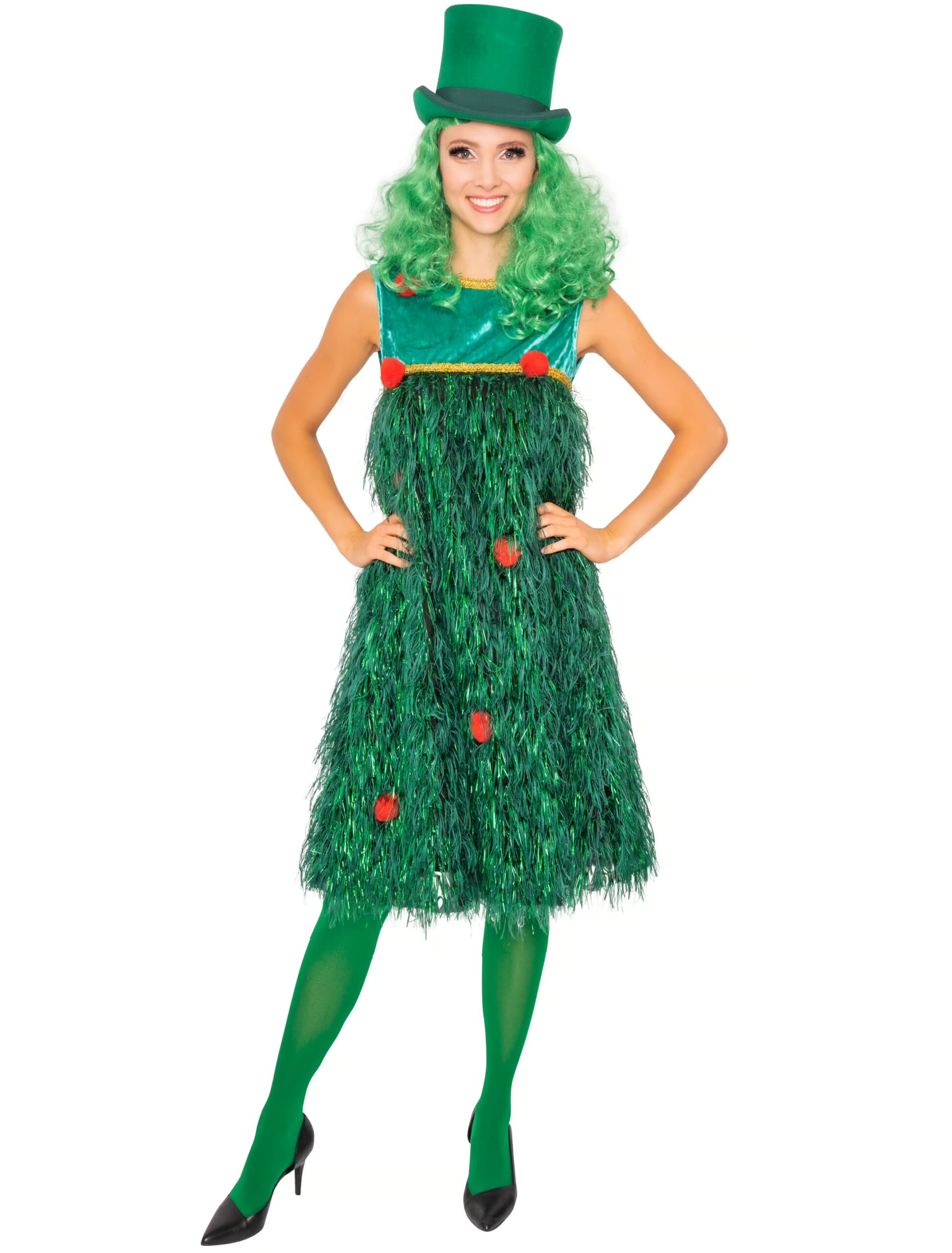 Den außergewöhnlichsten Auftritt aller Zeiten legst Du als Weihnachtsbaum hin. Das ärmellose Kleid aus Polyester weist einen zweilagigen Rock und bequeme breite Schulterträger auf. Das Kostüm versteht sich von selbst, dass dieses Kleid komplett in Grün gehalten ist. Wunderschöne Details sind die roten Glitzerpompons, die eingearbeiteten Lametta- und Stoffstreifen sowie die goldenen Zierborten. Mir Zylinder, grünen Strümpfen und Perücke bist Du der schönste Weihnachtsbaum weit und breit, den jeder gerne mit nach Hause nehmen würde.