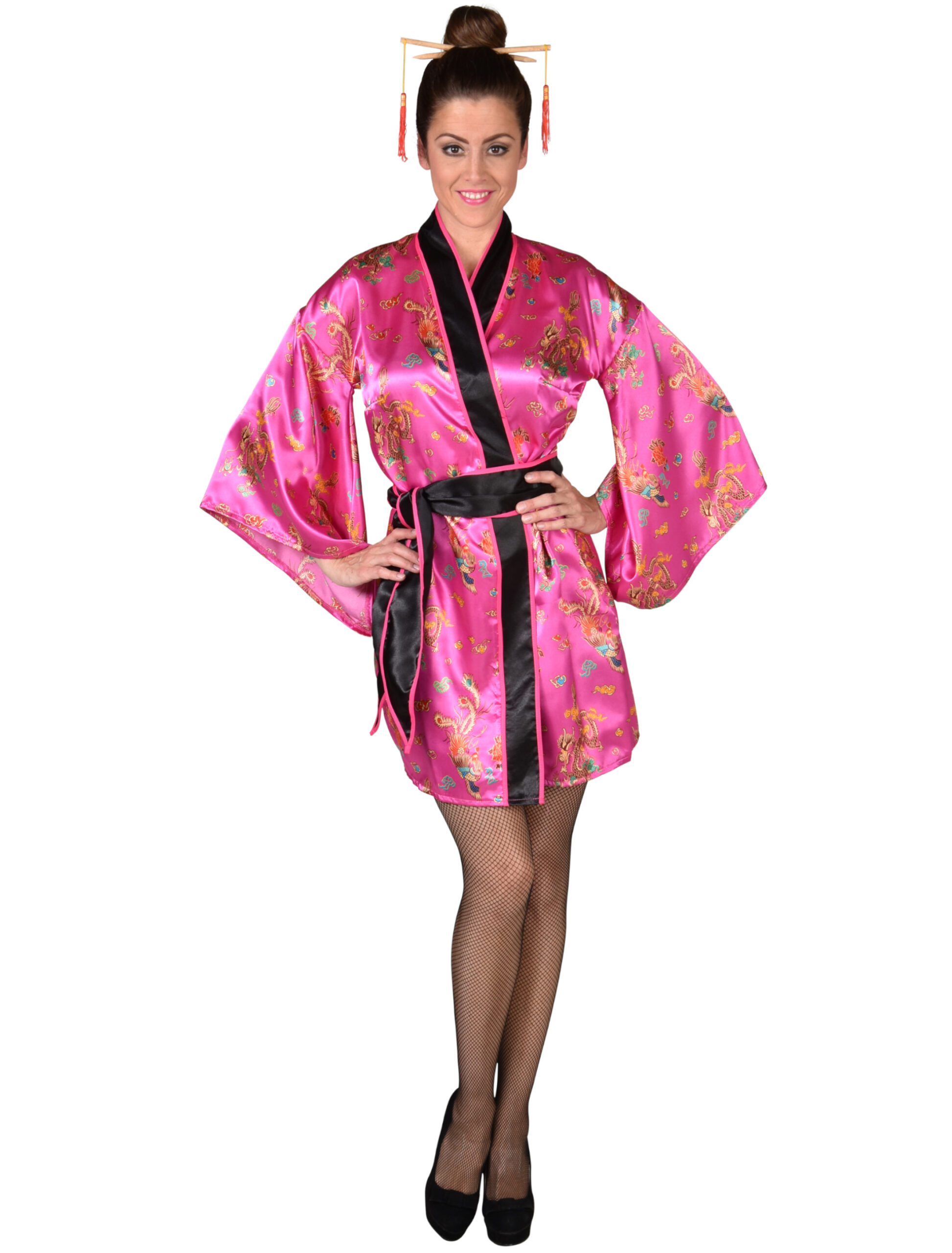 In diesem zauberhaften, zweiteiligen, pink-schwarzen Geisha Kostüm aus seidig glänzendem Polyester bist Du der Star auf jeder Faschings- oder Mottoparty. Schön und anmutig verdrehst Du so manchem Partygast den Kopf. Das Kostüm besteht aus einem kurzen, pinkfarbenen, herrlich bedrucktem Kimono im Wickellook mit schwarzer Einfassung und weiten Ärmeln sowie einer pink eingefassten schwarzen Schärpe. Mit diesem fernöstlichen Kostüm und den passenden Accessoires aus unserem Shop wirst Du garantiert von den Herren bewundert und den Damen beneidet.