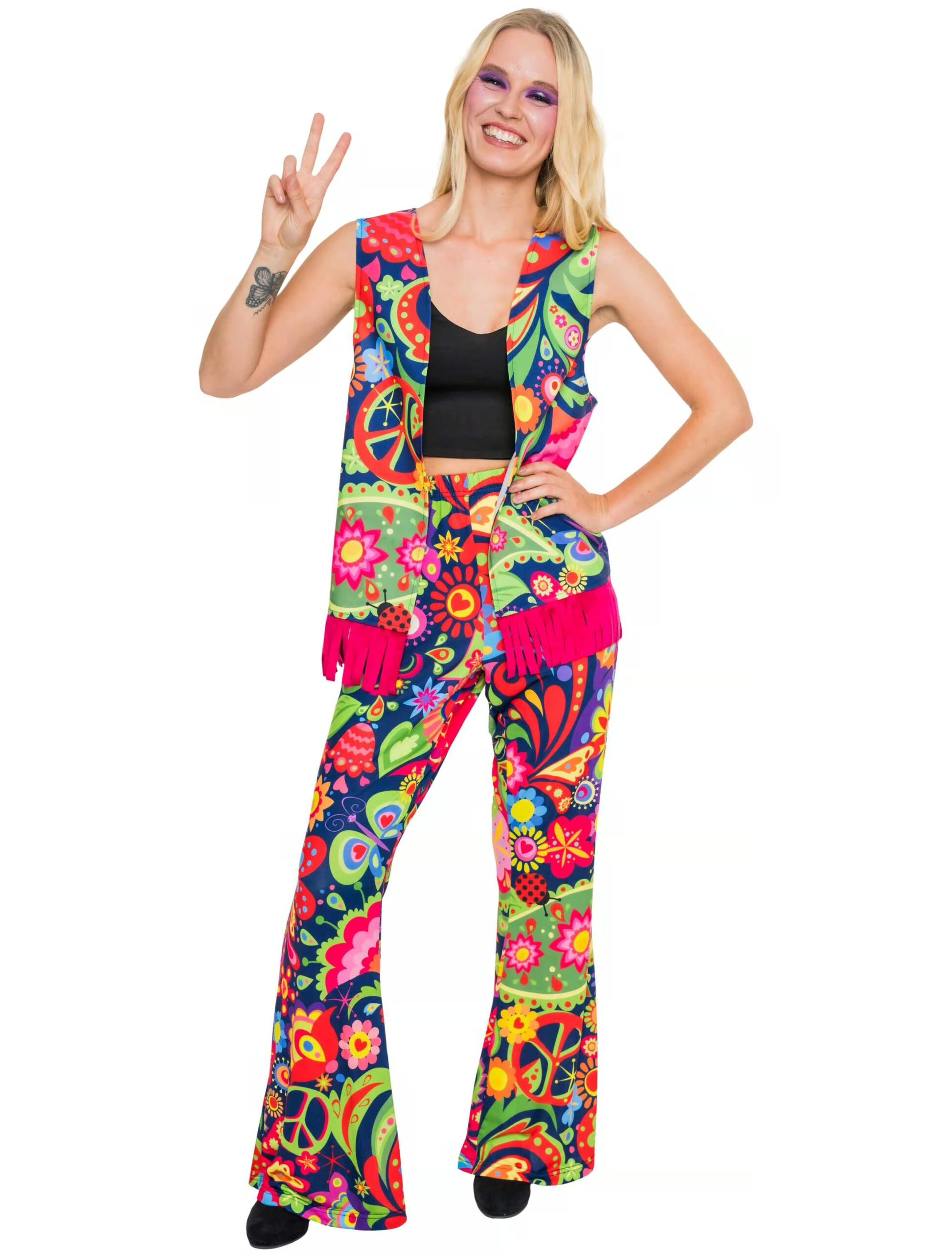 Flower Power – Lass die guten Vibes fließen! Erobere die Welt im bunten Stil mit diesem Hippie Kostüm bestehend aus einer fransigen Weste und der passenden Hose. Werde zum Inbegriff von Frieden, Liebe und einer ganzen Menge Spaß! Perfekt für Festivals, Mottopartys oder Karneval – In diesem Kostüm wirst du nicht nur die Blicke auf dich ziehen, sondern auch die besten Vibes verbreiten. Tanz zu den groovigsten Beats und vergiss nicht: Die Welt braucht mehr Liebe – und noch mehr Hippies!