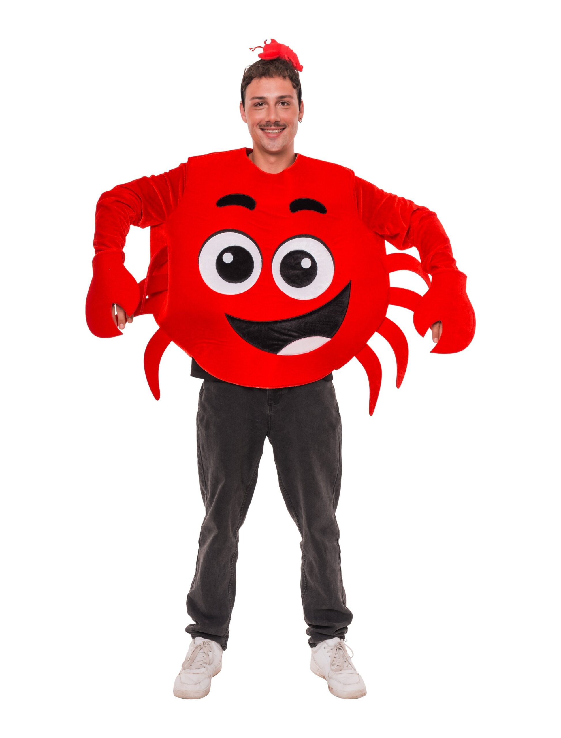 Mit unserem auffälligen Hummer Kostüm ziehst du garantiert alle Blicke auf dich – ob beim Karneval, auf der Motto-Party oder bei besonderen Events. Dein Kopf bleibt frei, während deine Arme in langen Ärmeln stecken, die an den Enden große Hummerscheren tragen. Durch den Gummizug am Handgelenk bleiben sie sicher an ihrem Platz, egal wie viel du dich bewegst. An den Seiten sind auf jeder Seite vier Hummerbeine befestigt, die den lustigen Meeres-Look abrunden. Vorne strahlt ein großer Smiley mit Augen und Mund, und dank Klettverschluss am Rücken geht das An- und Ausziehen ganz einfach.