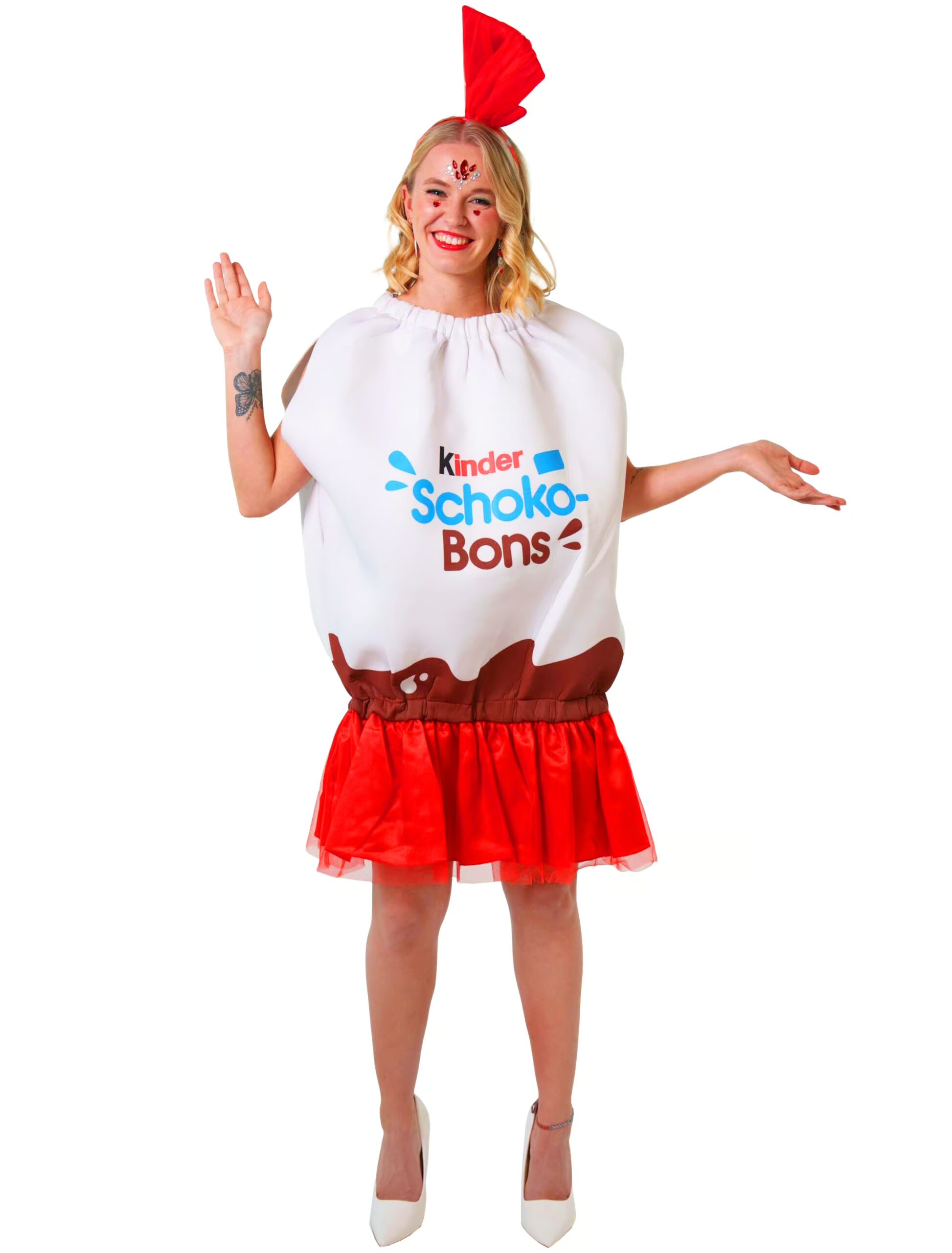 Wir feiern Karneval mit kinder! Holt Euch jetzt das original kinder Schoko-Bons Kostüm! Das ärmellose Kostüm kommt in Optik des süßen kinder Schoko-Bons. Unterhalb ist das Kostüm mit einem roten Tüllstoff abgesetzt, obenrum in weiß gehalten und mit dem kinder Schoko-Bons Logo bedruckt. Als Highlight komplettiert man das Kostüm mit dem passenden kinder Schoko-Bons Haarreif. Mit der passenden Strumpfhose für Damen oder der passenden Hose für Herren sowie weiteren Accessoires kannst Du Dein kinder Schoko-Bons Outfit perfekt vervollständigen. Werde an Karneval und Fasching zum süßen kinder Schoko-Bon! Das perfekte Kostüm für Gruppen- und Vereine! Offizielles Merchandise – Exklusiv bei uns!