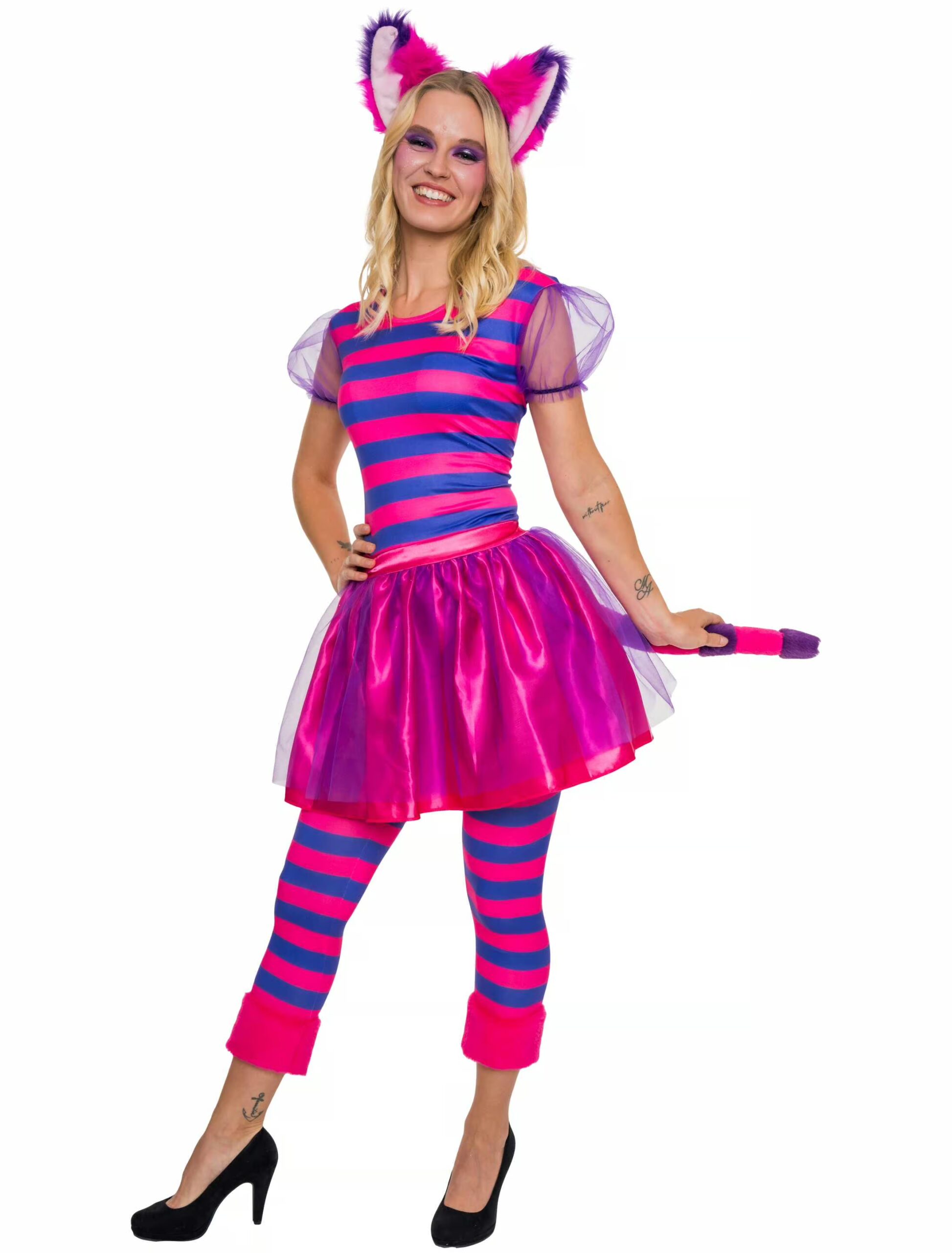 Mit unserem Damen Kostüm lachende Katze wirst du zum strahlenden Mittelpunkt jeder Party! Dieses verspielte Outfit besteht aus einem charmanten Kleid und einer dazu passenden Leggings, die dich in einen fantasievollen Katzen Look verwandeln, der garantiert jeden verzaubert! Das Kleid besticht durch seinen bunten, auffälligen Stil, der den verrückten, aber unwiderstehlich lustigen Charakter der lachenden Katze perfekt einfängt. Kombiniere dein Outfit mit ein paar süßen Katzenohren, einem frechen Grinsen und vielleicht einer kleinen Portion geheimnisvoller Verrücktheit. Lustig, verspielt und einfach purr-fekt – dein Must-have für Karneval, Mottopartys oder Halloween!