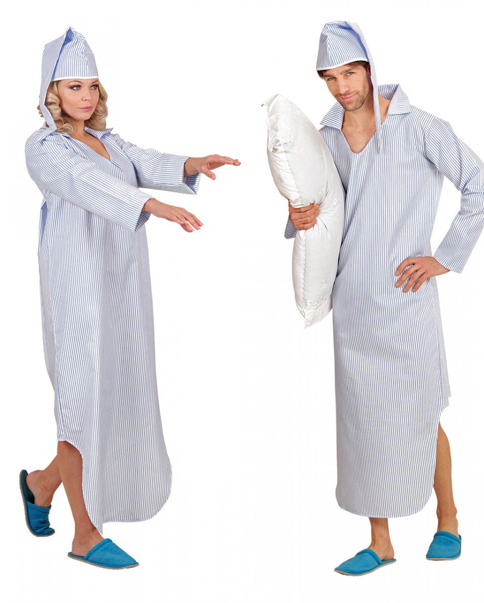 Kostüm Nachthemd mit Streifen für Fasching Lustige Fastnacht-Verkleidung für deinen Auftritt als Schlafmütze Wer noch nach witzigen Verkleidungen für die närrische Zeit sucht, liegt bei unserem Kostüm Nachthemd mit Streifen für Fasching absolut richtig! Auf Karnevals-Feiern und Mottopartys wirst du garantiert herzhafte Lacher ernten und daheim kannst du direkt ins Bett fallen! Das Kostüm Nachthemd mit Streifen für Fasching besticht durch seine witzige Optik. Klassischen Nachtgewändern nachempfunden, sorgen grau-blaue Streifen auf Nachthemd und Zipfelmütze sowie der typische Schnitt für das charakteristische Aussehen. Abgerundet wird die lustige Karnevals-Verkleidung von einer Zipfelmütze, die auch Zwergen gut zu Gesicht stünde. Lieferumfang: 1x Kostüm Nachthemd mit Streifen für Fasching Inhalt: 1 Nachthemd, 1 Zipfelmütze (Schlappen und Kissen nicht inkl.) Farbe: weiß/blau Größe: M/L = 50-52 , XL = 54 Material: 100% Polyester Mit lustiger Zipfelmütze als Bettmütze Unisex, lustiges Paarkostüm Der Artikel ist ein Kostüm für Erwachsene und kein Spielzeug. Nicht für Kinder unter 3 Jahren geeignet. Kann Kleinteile enthalten, die verschluckt werden können – Erstickungsgefahr. Von Feuer und offenen Flammen fernhalten.