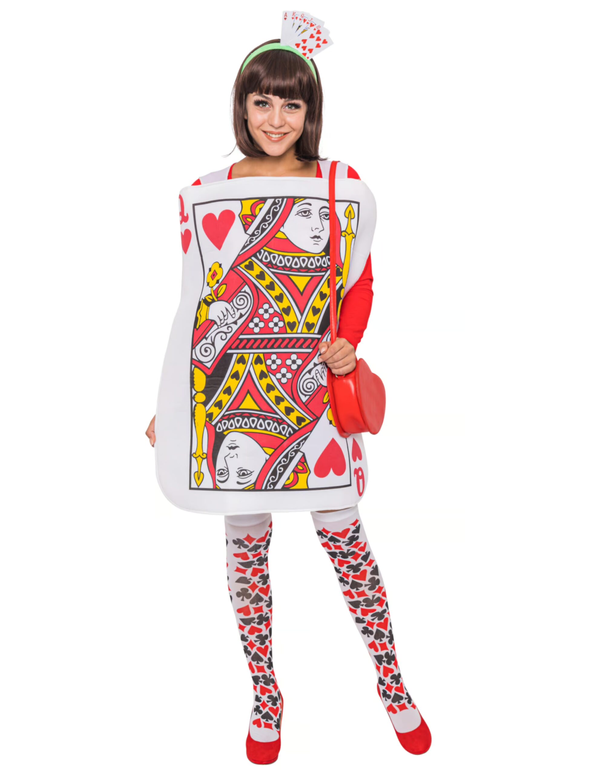 Das originelle Spielkartenkostüm Herz Dame aus Polyester ist das optimale Outfit für Kurzentschlossene, die am Mittag noch nicht wissen, als was sie am Abend zu einem Kostümfest oder einer Motto-Party gehen. Das weiße Kostüm zum Überziehen kann ganz einfach über der Kleidung getragen werden und ist deshalb auch für den Straßenfasching tauglich. Die Vorderseite ist detailgetreu mit der Karte der Herzdame aus dem französischen Kartenspiel in Schwarz, Rot und Gelb bedruckt. Gehörst auch Du zu den Kurzentschlossenen, könnten die Karten für Dich neu gemischt werden und Du begegnest vielleicht schon auf der nächsten Faschingsfeier Deinem Herzblatt.