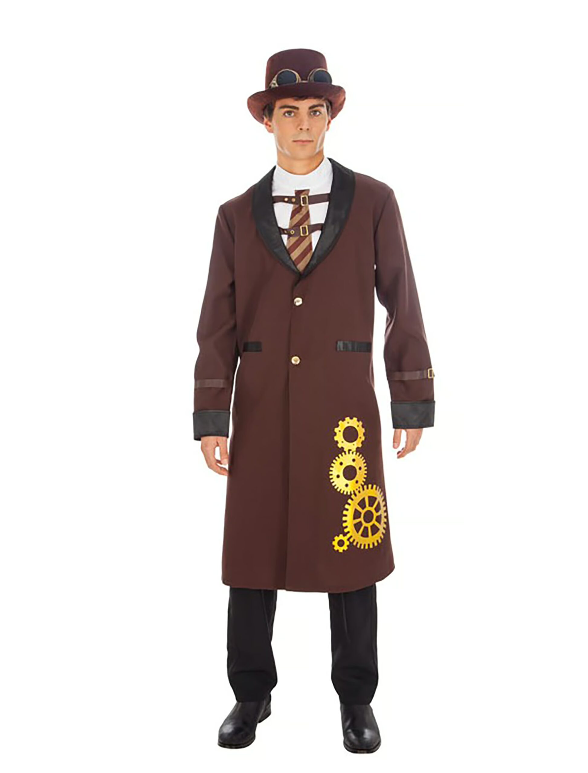 Bereit für dein Abenteuer durch Raum und Zeit? Mit unserem fünfteiligen Steampunk Kostüm für Herren bist du bestens ausgerüstet! Der aufwendig gestaltete Gehrock mit Zahnrad-Design, Knöpfen und Schnallen sorgt für den typischen Look, während die schlichte Hose mit Gummibund für Komfort sorgt. Der angenähte Kragen mit Krawatte macht’s besonders einfach, und der passende Hut samt Brille rundet dein Outfit stilvoll ab. Ideal für Karneval, Steampunk-Partys oder fantasievolle Mottos!