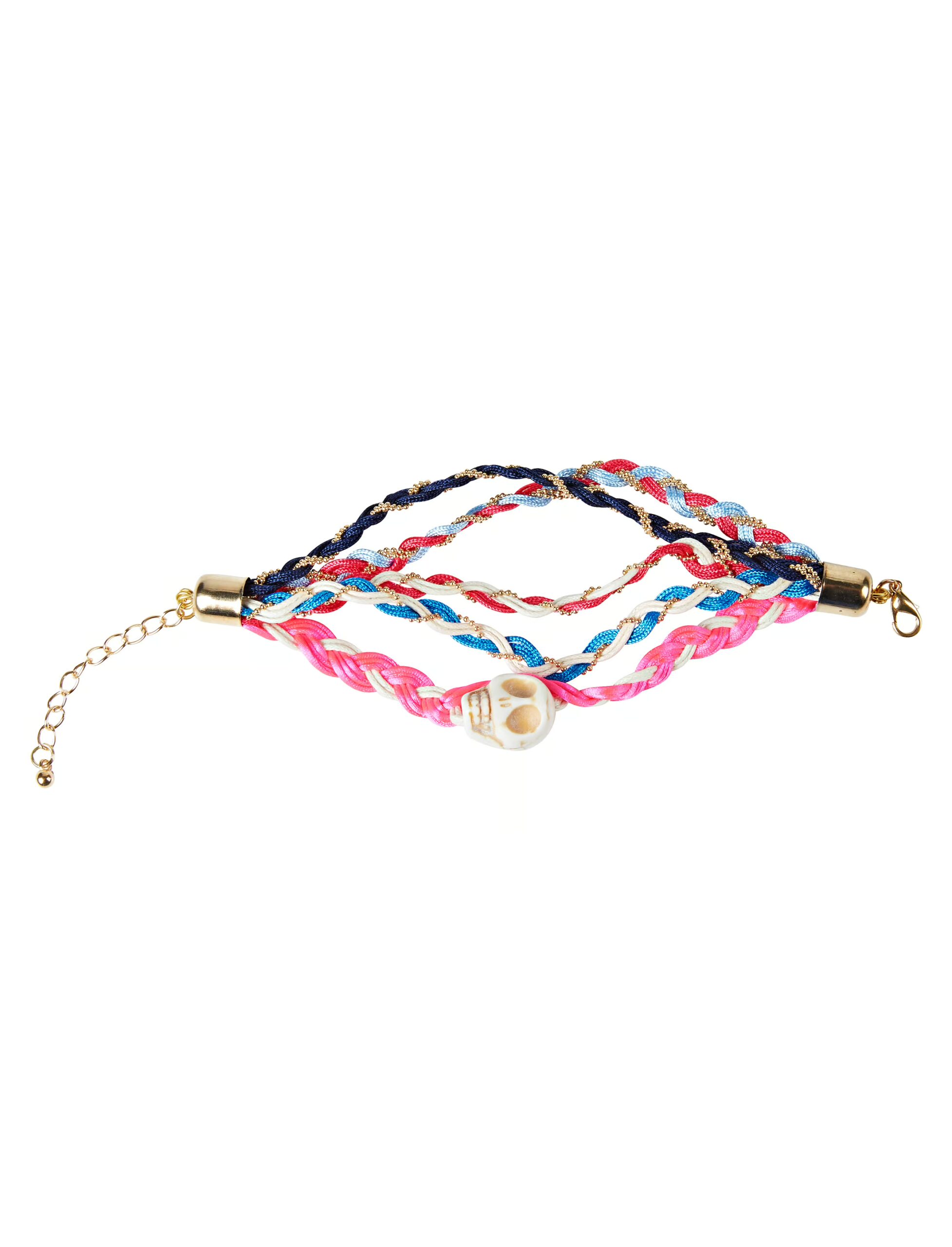 Du bist auf der Suche nach einem passenden Accessoire für Dein Tag der Toten (Dia de los Muertos) Kostüm? Dieses bunte, geflochtene Armband wird mit einem kleinen Totenkopf geziert und macht Dein Outfit komplett. Das Armband besteht aus Kunstharz und ist mit Hilfe eines Karabiner-Verschlusses zu schließen. Ein schönes Accessoire zu Halloween.