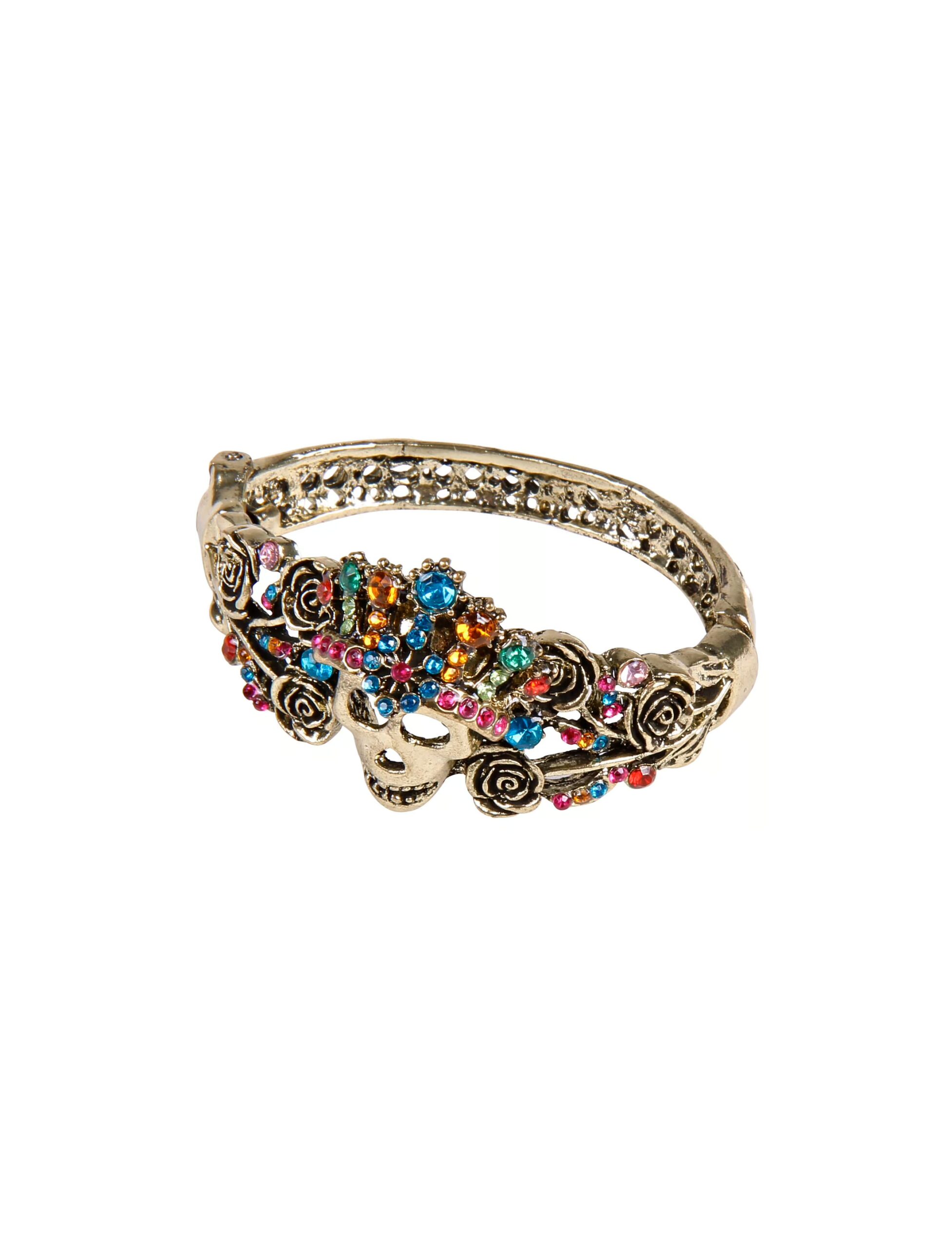 Deine Verkleidung soll etwas ganz Besonderes werden und Dir fehlt noch das ein oder andere Accessoire? Dieser Armreif aus Metall in Gold mit bunten Kristallen wird Dir sicherlich gefallen. Verziert mit einem Totenkopf und mehreren Rosen fällt dieser Armreif an Deinem Handgelenk auf jeden Fall auf. Ein schönes Accessoire für die nächsten Halloween- oder Mottoparty.