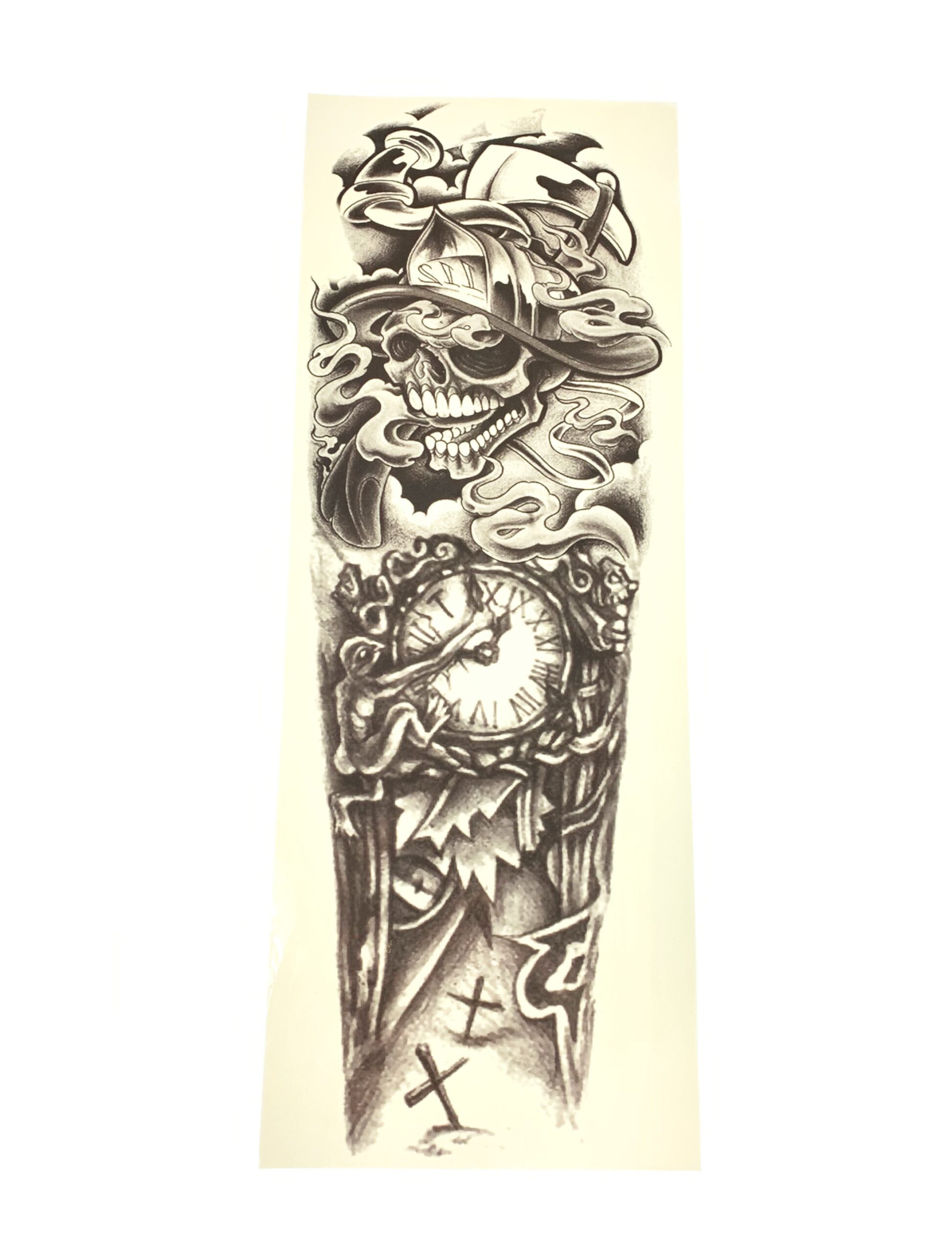 Wir haben da etwas für Dich, um Dein Rocker- oder Punker-Outfit authentischer wirken zu lassen. Dieses perfekte Armtattoo in Schwarz-Weiß, das mit vielen Details wie einer Uhr, einem Totenkopf und Grabkreuzen verziert ist, darf hier auf keinen Fall fehlen. Das Armtattoo hat die Maße von 45,5 x 16,5 cm. Dieses Tattoo wird mit einem feuchten Tuch oder Schwamm auf den Oberarm aufgetragen. Ideal für Karneval und Fasching!