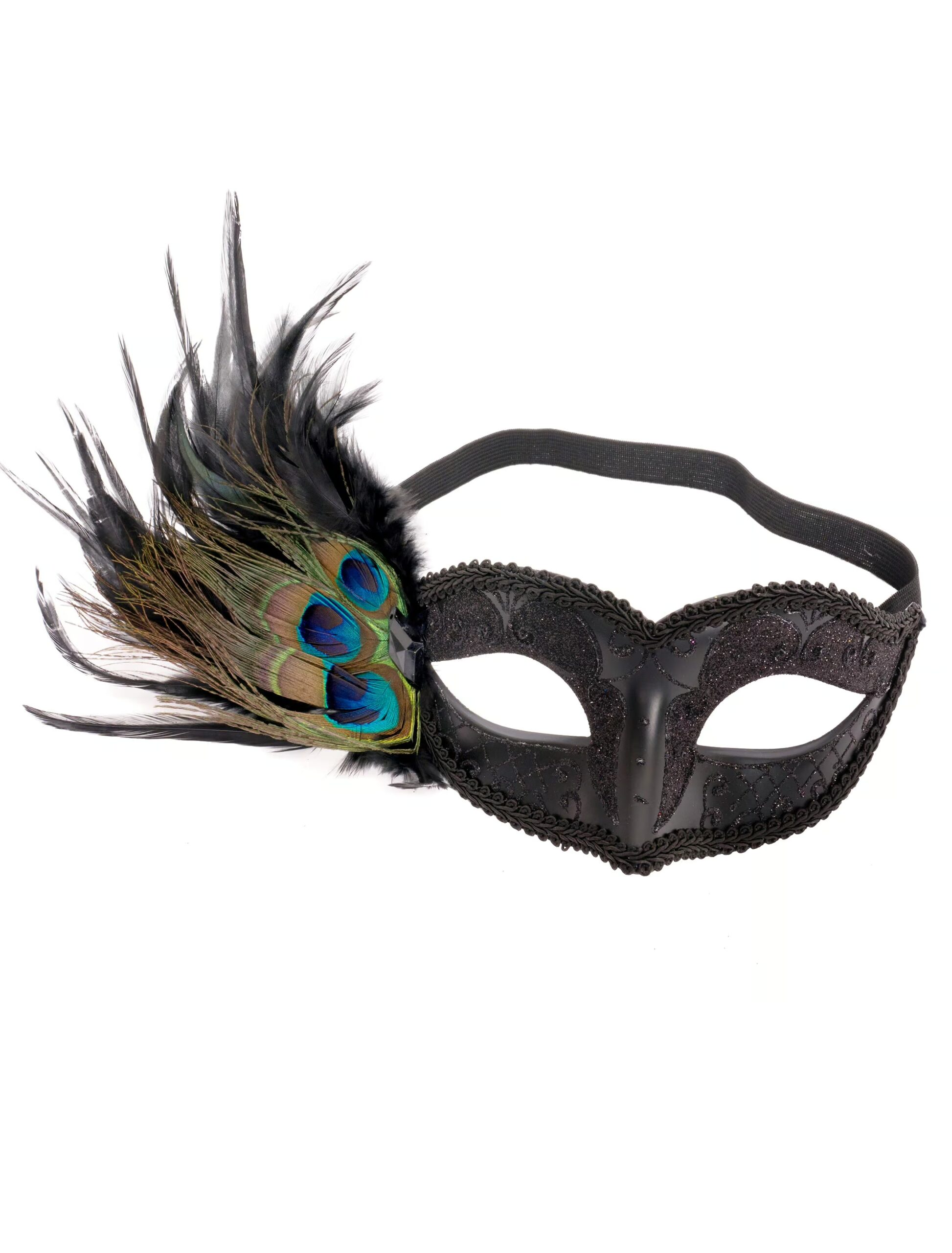 Mit dieser schwarzen Augenmaske mit Federn bist Du der Hingucker auf jeder Party. Eine hochwertige Maske aus Kunststoff mit echten Pfauenfedern sowie einem Gummiband für einen optimalen Halt. Die 20 cm langen Federn hinterlassen einen wunderbaren, optischen Eindruck, mit dem Du spielerisch umgehen kannst und jeden beeindruckst. Du bist damit der Hingucker auf jeder Party!