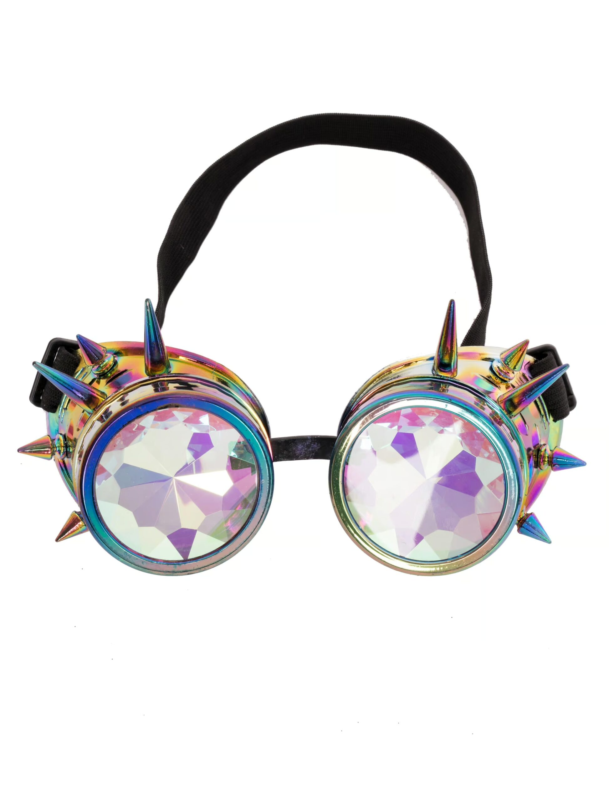 Mit dieser Steampunk Brille wirst Du auf jedem Festival oder jeder Party der absolute Star und Hingucker sein. Die bunt schimmernde Brille ist aus Kunststoff gefertigt. Für den sicheren Halt auf dem Kopf sorgt ein Gummiband. Die Gläser sind im Kaleidoskop Design und auf der Fassung sind verschieden lange Nieten angebracht, die das gewisse Etwas aus Dir machen.