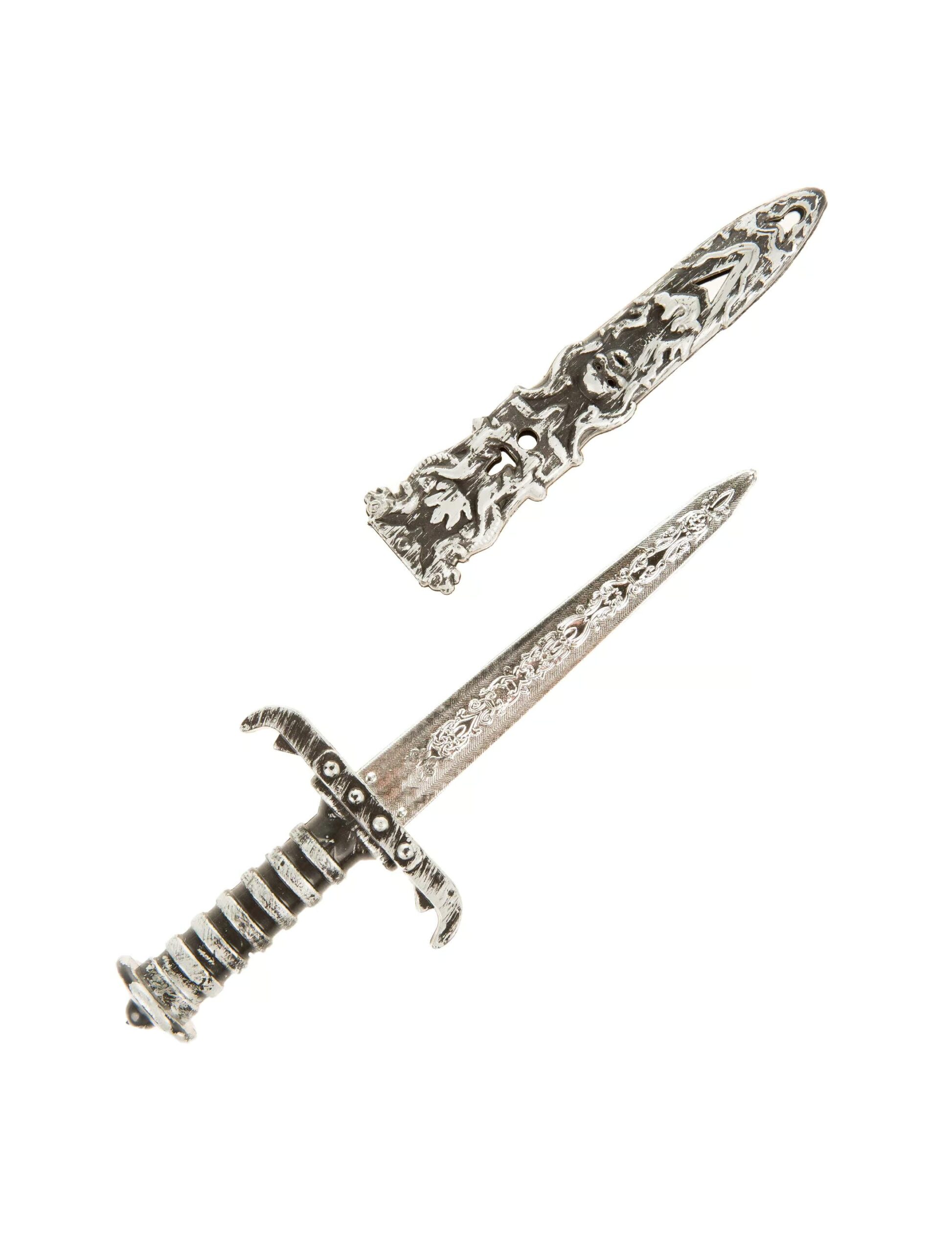 Jeder Kostüm-Pirat weiß um die Bedeutung einer guten Waffe, mit der er gelungene Angriffe starten oder sich im Notfall verteidigen kann. Und wer nicht nur auf den praktischen Nutzen achtet, sondern außerdem auch Wert auf Design legt, für den ist der kleine Dolch mit Scheide vortrefflich geeignet! Die aufwendigen Verzierungen am Griff und an der Klinge heben die Waffe vom normalen Ausrüstungsteil ab und machen es zu einem echten Schmuckstück. Der 24,5 cm lange Dolch mit Scheide ist dabei alles andere als dezent.