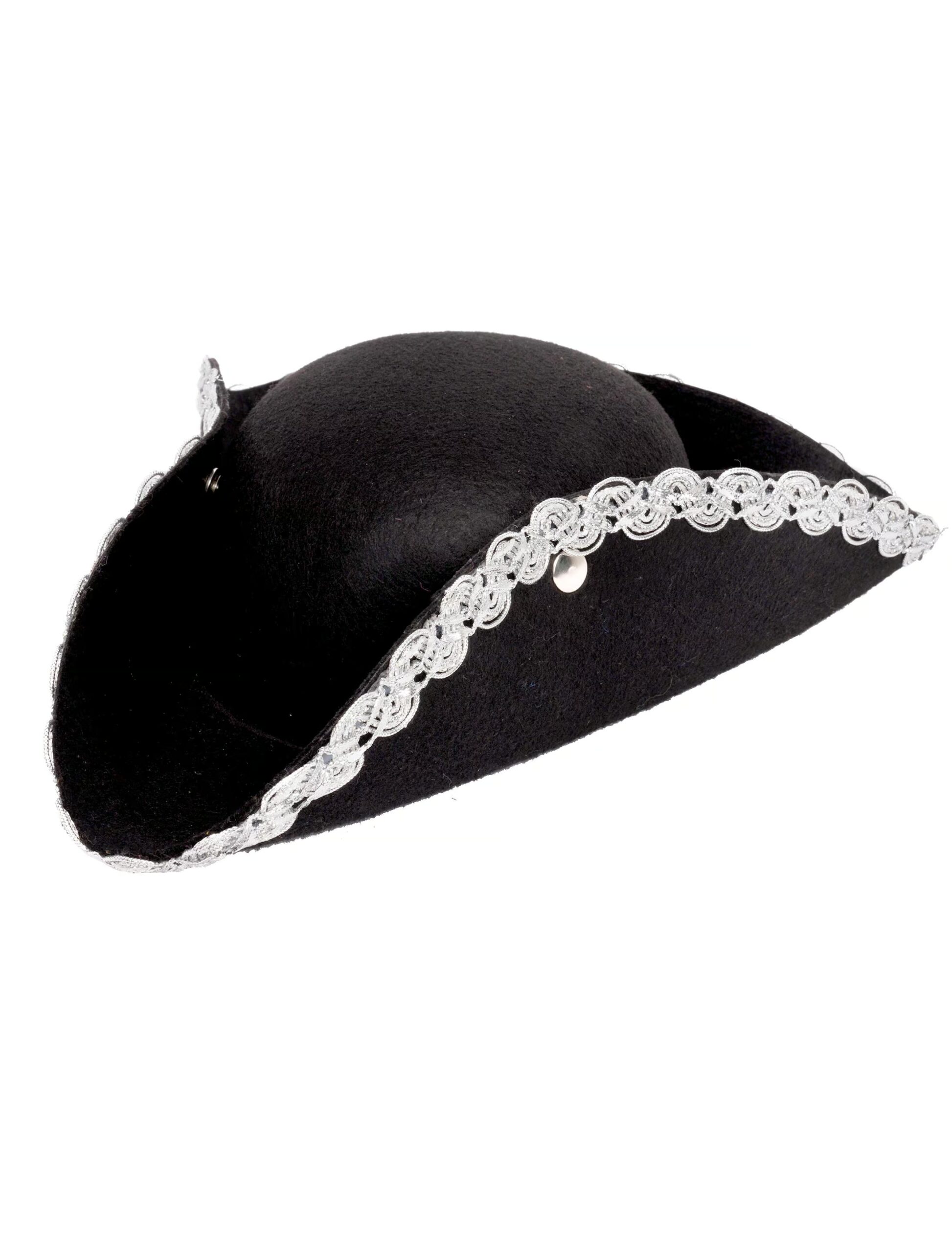 Dieser außergewöhnliche Hut ist ein sogenannter Dreispitz in Schwarz mit silberner Borte. Der Hut erhält seinen Namen daher, dass er vorne eine Spitze hat und drei Krempen, die nach oben geklappt sind, geben ihm seine Form. Silberne Verzierungen setzen gekonnt besondere Akzente. Der Kopfschmuck aus den 60er-Jahren lässt längst vergangene Zeiten wieder aufleben. Das Accessoire eignet sich hervorragend für Verkleidungen als Soldat, Pirat oder einem edlen Herren aus der gehobenen Gesellschaft. Der Dreispitz lässt die Mode der Vergangenheit wieder aufleben und verleiht Deinem Kostüm den letzten Schliff.