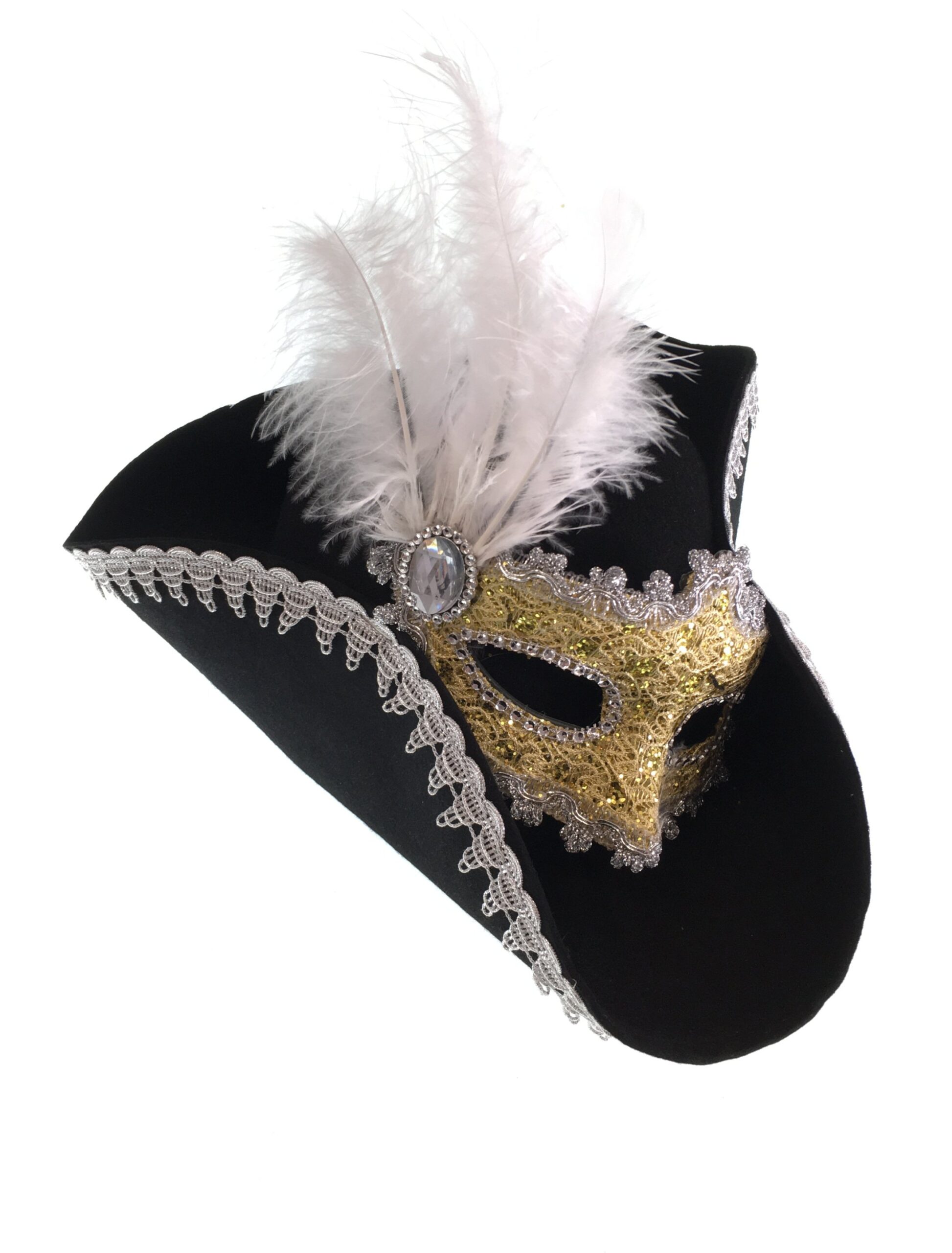 Du bist auf der Suche nach einer schicken Kopfbedeckung für Dein venezianisches Kostüm? Dieser schwarze Dreispitz aus Wollfilz mit venezianischer Maske ist ein echter Hingucker. Mit einer silbernen Spitzenborte ist dieser geziert. Der hochwertige Dreispitz entspricht einem Kopfumfang von ca. 58 cm und besteht aus reiner Wolle. Ein echter Blickfang für Dein Barock Kostüm!