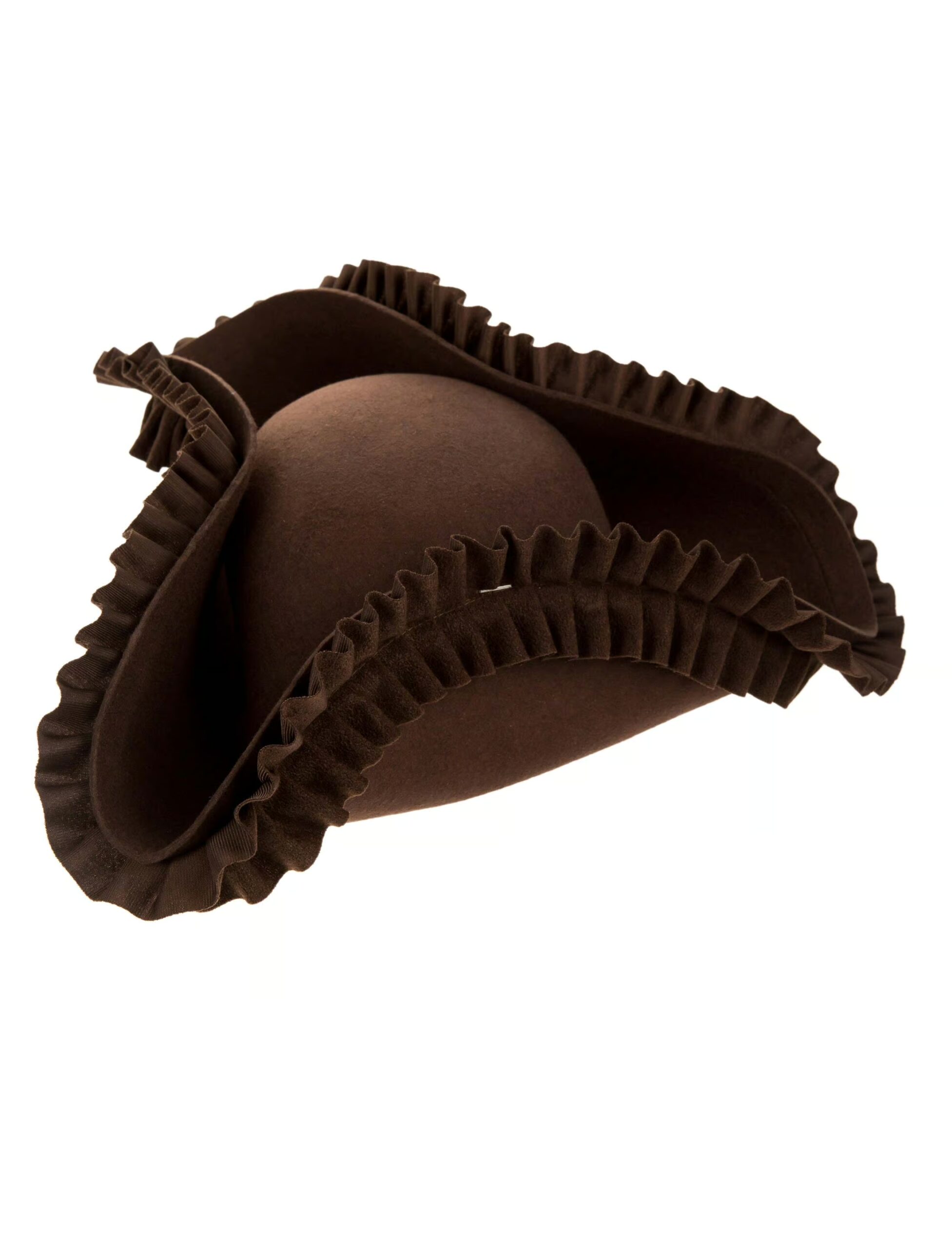 Mit dieser prachtvollen Kopfbedeckung haben sich unsere Hutmacher mal wieder besonders große Mühe gegeben! Der historische Dreispitz kann sowohl von Männern als auch von Frauen getragen werden und ist ein echtes Highlight für Dein Kostüm! Dieses Modell ist aus sehr hochwertigem, braunen Wollfilz gefertigt und strahlt pure Eleganz aus. Die nach oben geschlagene Krempe ist rundherum mit einer wundervollen Borte in Rüschen-Optik verziert und zieht alle Blicke auf sich. Damit gibst Du Deinem Party-Outfit den letzten Schliff!