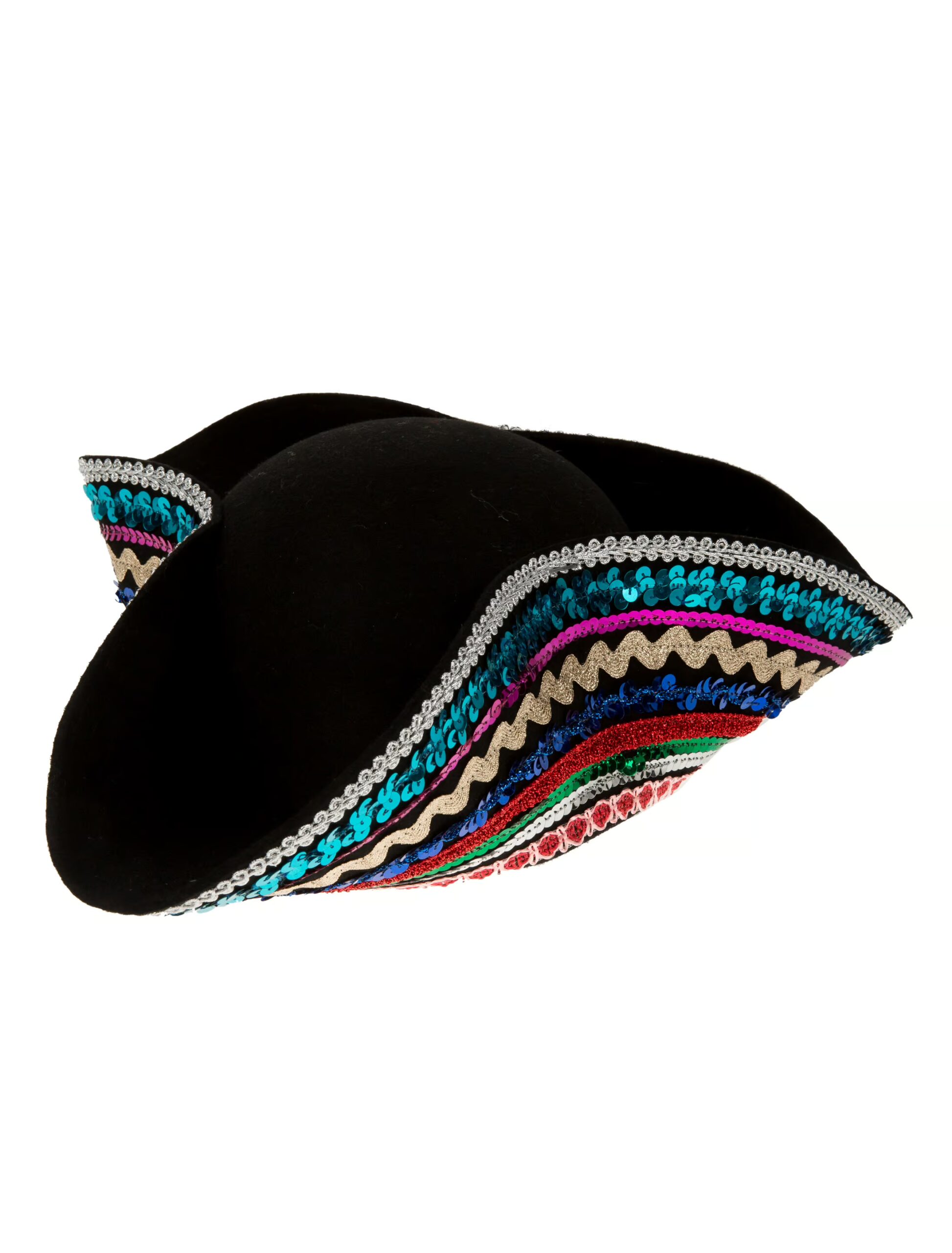 Als Piratenkapitän umsegelst Du die sieben Weltmeere, plünderst Inseln und suchst nach Schätzen. Ausnahmsweise legst Du für Karneval und Fasching am Hafen an. Unser Dreispitz Wollfilz mit bunten Pailletten-Besatz darf hier nicht fehlen. Der Dreispitz hat einen Durchmesser von 29 cm, eine Höhe von 10 cm sowie eine Hutgröße von ca. 55. Diese schöne Kopfbedeckung passt wunderbar zu Deinem Kostüm an Karneval und Fasching. Der Dreispitz ist aus 100% Wolle gefertigt. Das Produkt beinhaltet nur einen Dreispitz.