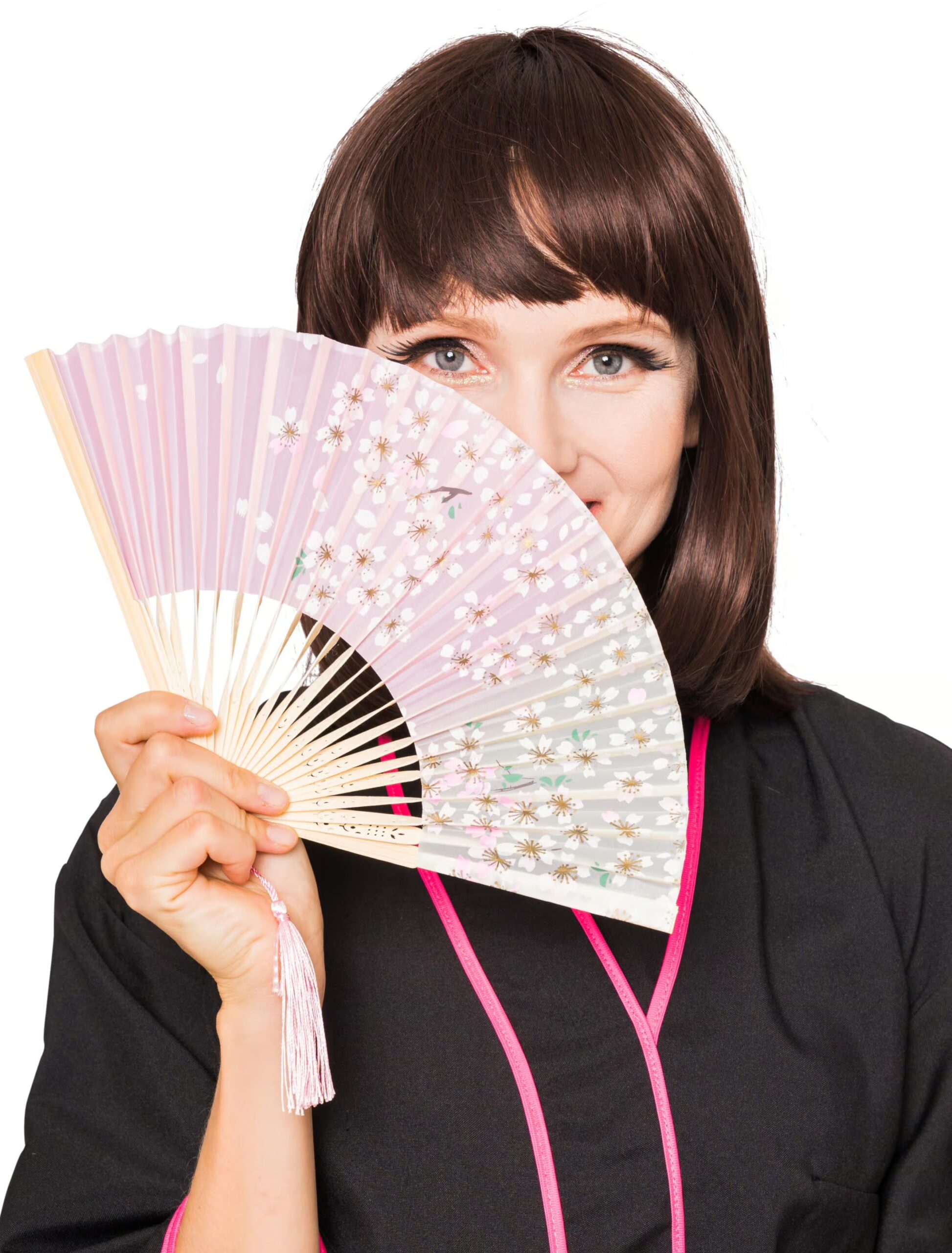 Auf der Suche nach einem passenden Accessoire für ein asiatisches Kostüm? Dann bist Du bei diesem Artikel genau richtig! Dieser Handfächer in Rosa ist mit weißen Blüten und Blättern bedruckt und darf hier auf keinen Fall fehlen. Der Fächer hat eine Größe von 21 cm und ist aus Bambus und Kunststoff gefertigt. Ein schönes Accessoire zu Karneval und Fasching.
