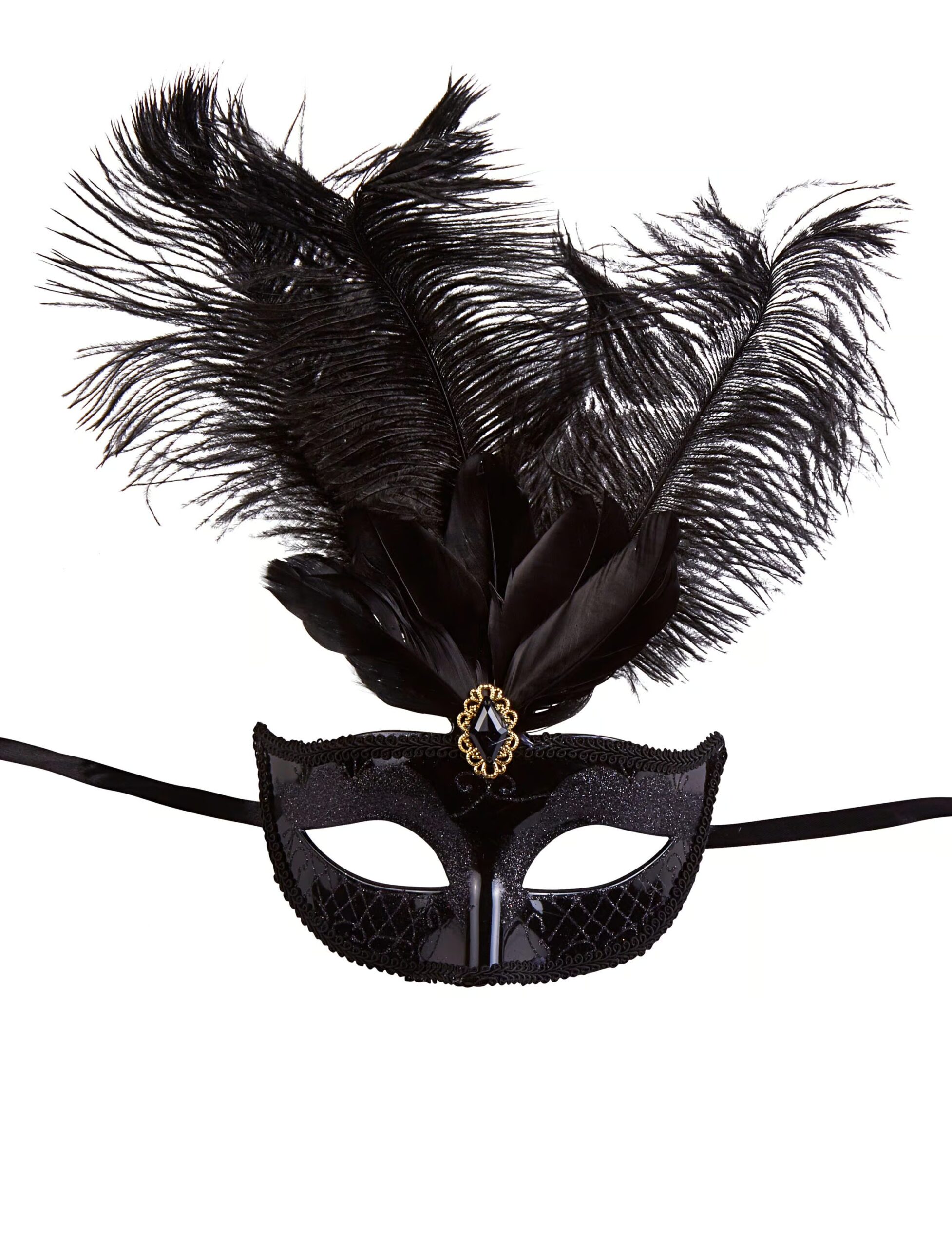 Den venezianischen Karneval gibt es nicht nur in Venedig. Auch hierzulande kann man die exotischen Masken bewundern und jedes noch so schlichte Kostüm aufpeppen. Die schwarze Maske mit Federn wird anhand eines Gummibandes fixiert und hat damit den perfekten Halt auf jeder Karnevals-, Motto-, oder Maskenparty!