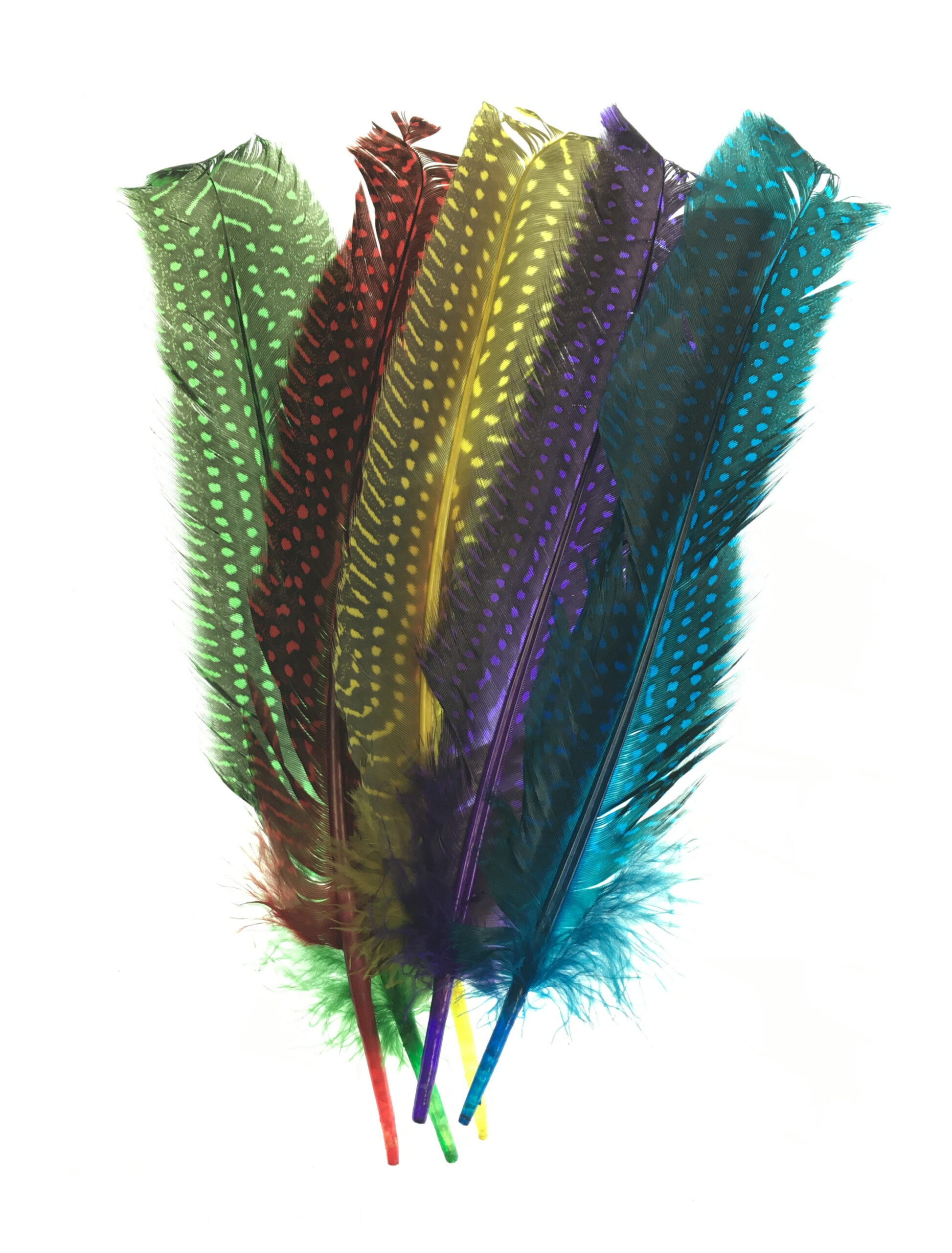 Die fünf bunten Federn können besonders gut zum Basteln genutzt werden. Sie sind in violett, gelb, grün, blau und türkis gefärbt. Du kannst sie in Dein Indianerkostüm einbauen oder aber als Deko in Deiner Bastelarbeit verwenden. Die Federn sind 21 cm lang und haben ein Punkt- oder Streifenmuster. Ideal für Karneval und Fasching!