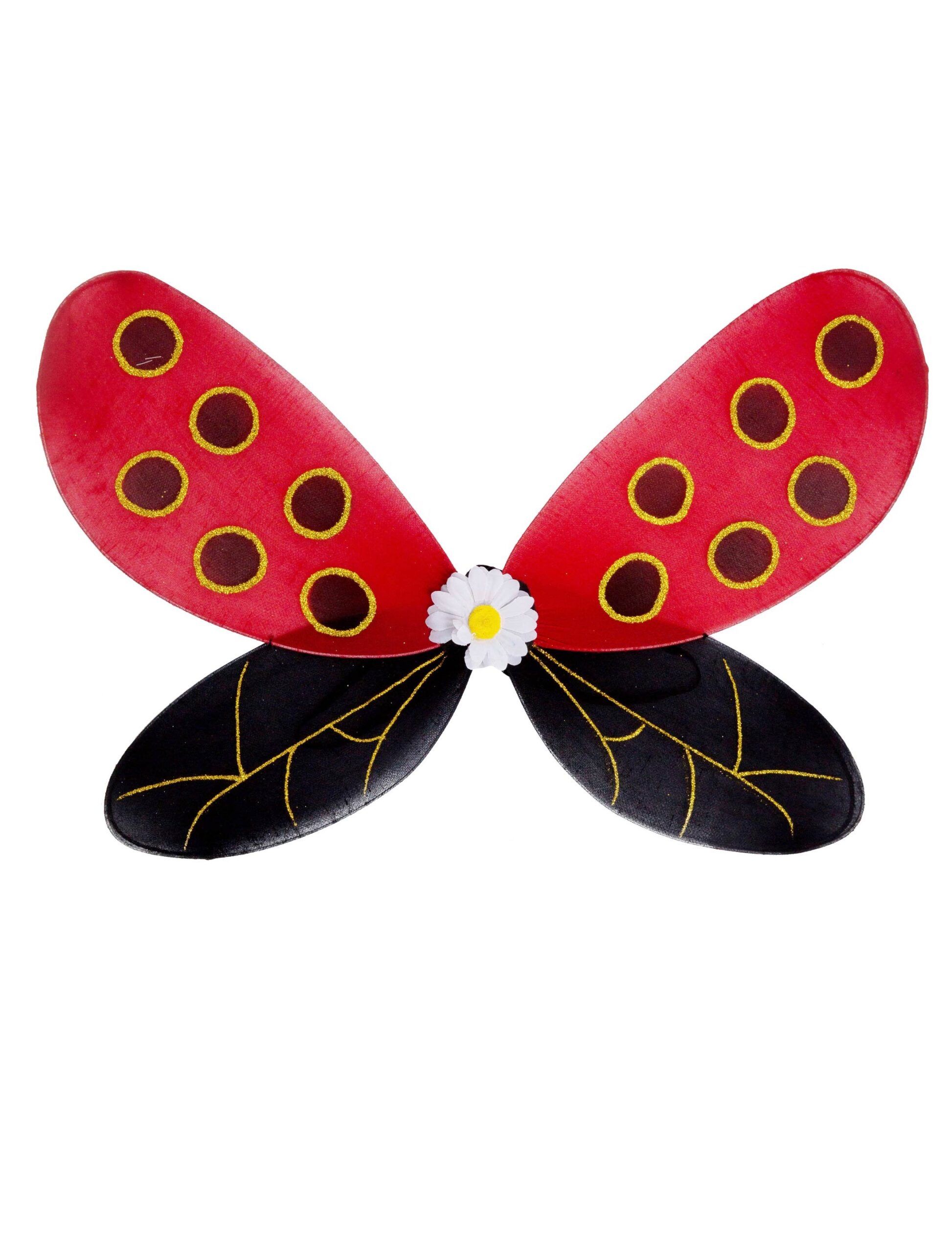Mit diesen prächtigen Flügeln verwandelst Du Dich in einen besonders niedlichen Marienkäfer! Die schwarz-roten Flügel sind mit großen Punkten, feinen Linien und einer herrlichen, weißen Kunstblüte verziert. Genau die richtige Ergänzung für Dein Karnevals-Outfit!