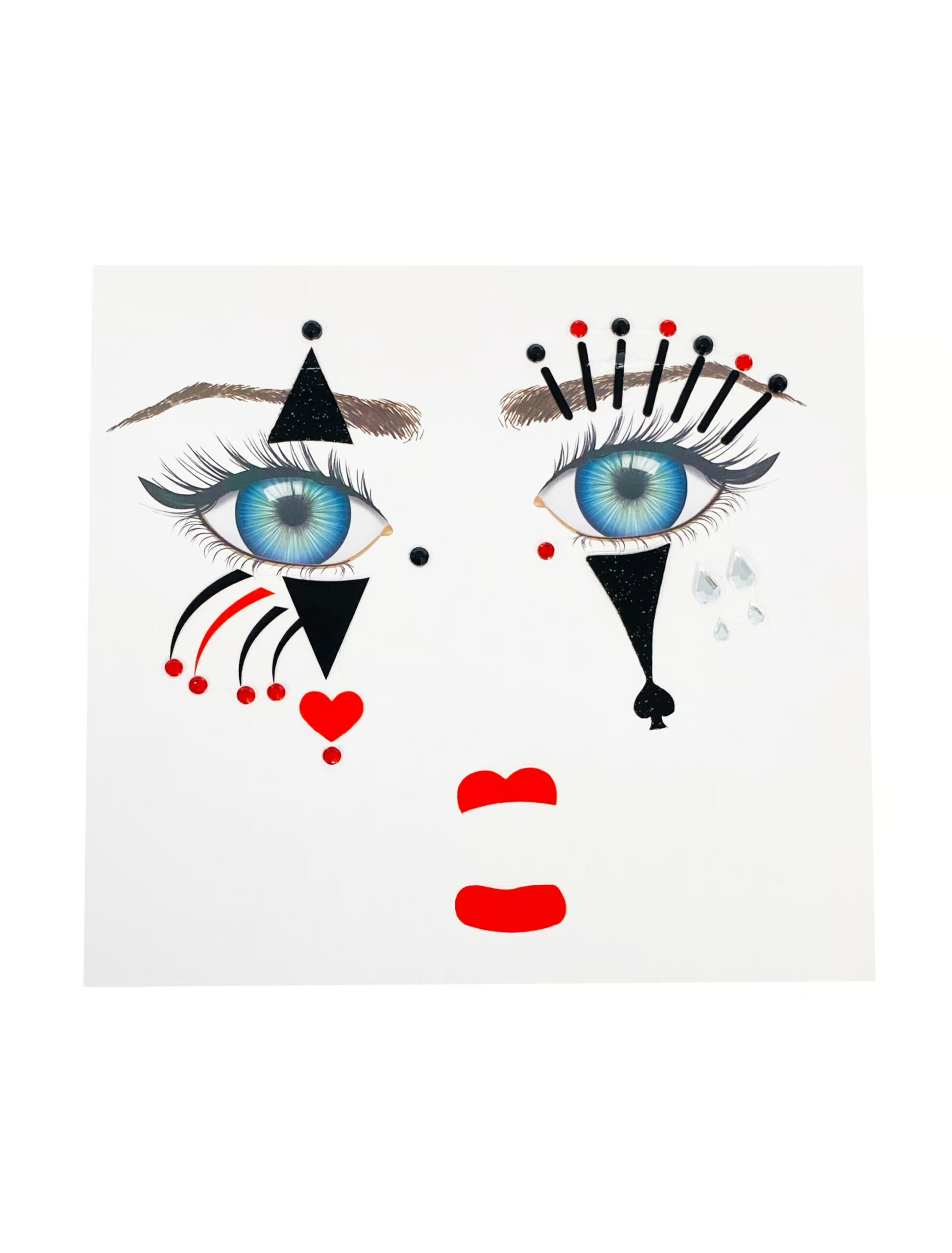 Mit dem 9-teiligen, selbstklebendem Gesichtstattoo Pantomime, bestehend aus farbigen Applikationen und Glitzersteinen, kannst Du Dein Outfit als trauriger Clown zum Karneval, Motto-Partys sowie zu Halloween, ohne viel Mühe geschickt aufwerten. Ohne zeitraubende Schminkversuche erhältst Du mit diesen Applikationen ein super Make-Up für einen traurigen Clown oder andere Maskierungen. Du löst die einzelnen Teile einfach vom Trägerpapier ab und klebst sie auf die vorgesehenen Hautpartien und sofort hast Du einen außergewöhnlichen Gesichtsschmuck, um den man Dich beneidet. Gesichtssticker.