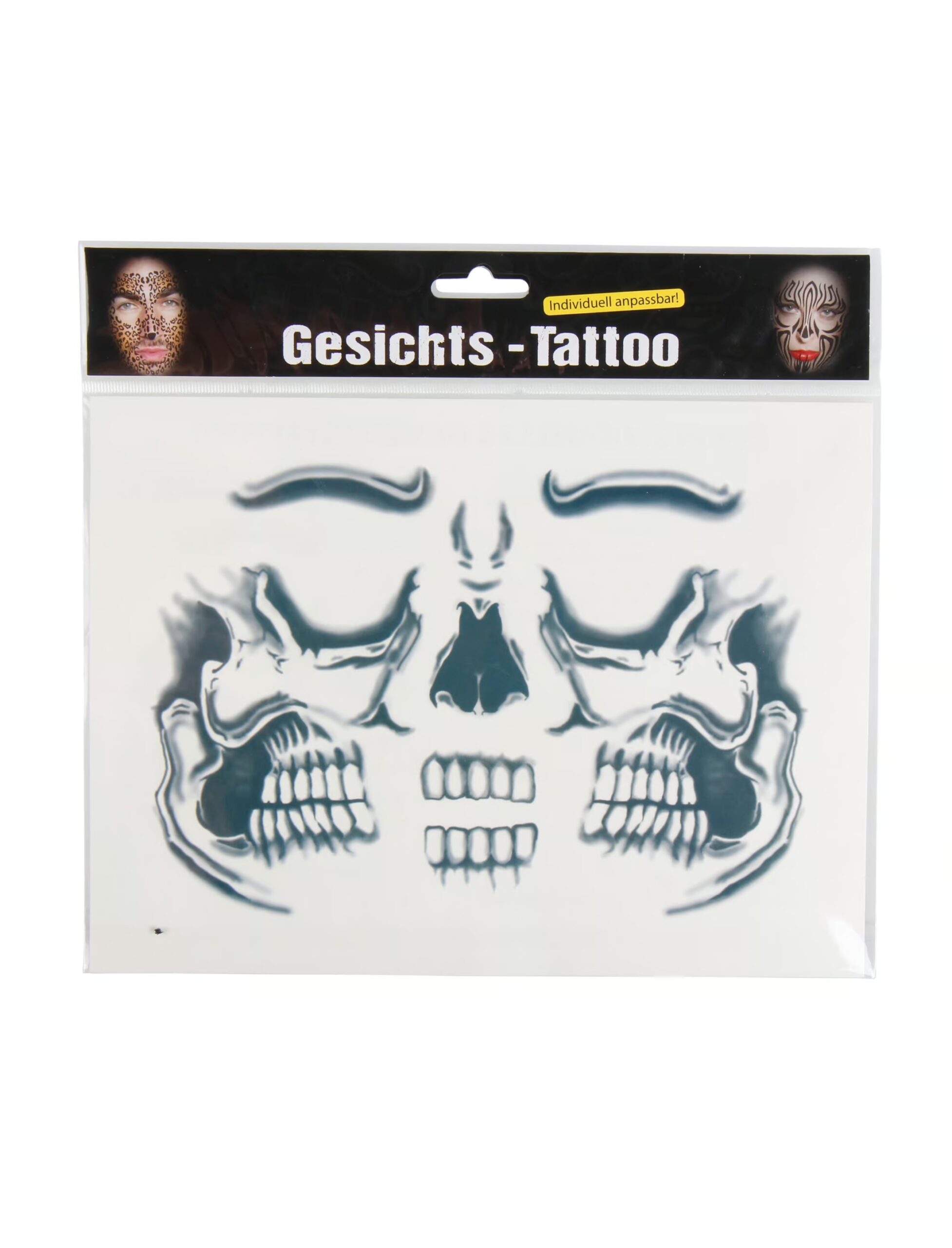 Unsere Gesichtstattoos sind eine echte Alternative zur klassischen Schminke! Die Skelett-Elemente lassen sich ganz einfach ausschneiden, mit einem feuchten Tuch auftragen und ergeben einen gruseligen Totenschädel. Das spart jede Menge Zeit und das Ergebnis kann sich wirklich sehen lassen. Und das Beste: das Tattoo lässt sich auch ganz leicht wieder entfernen. Die ideale Ergänzung für Dein Halloween-Outfit!