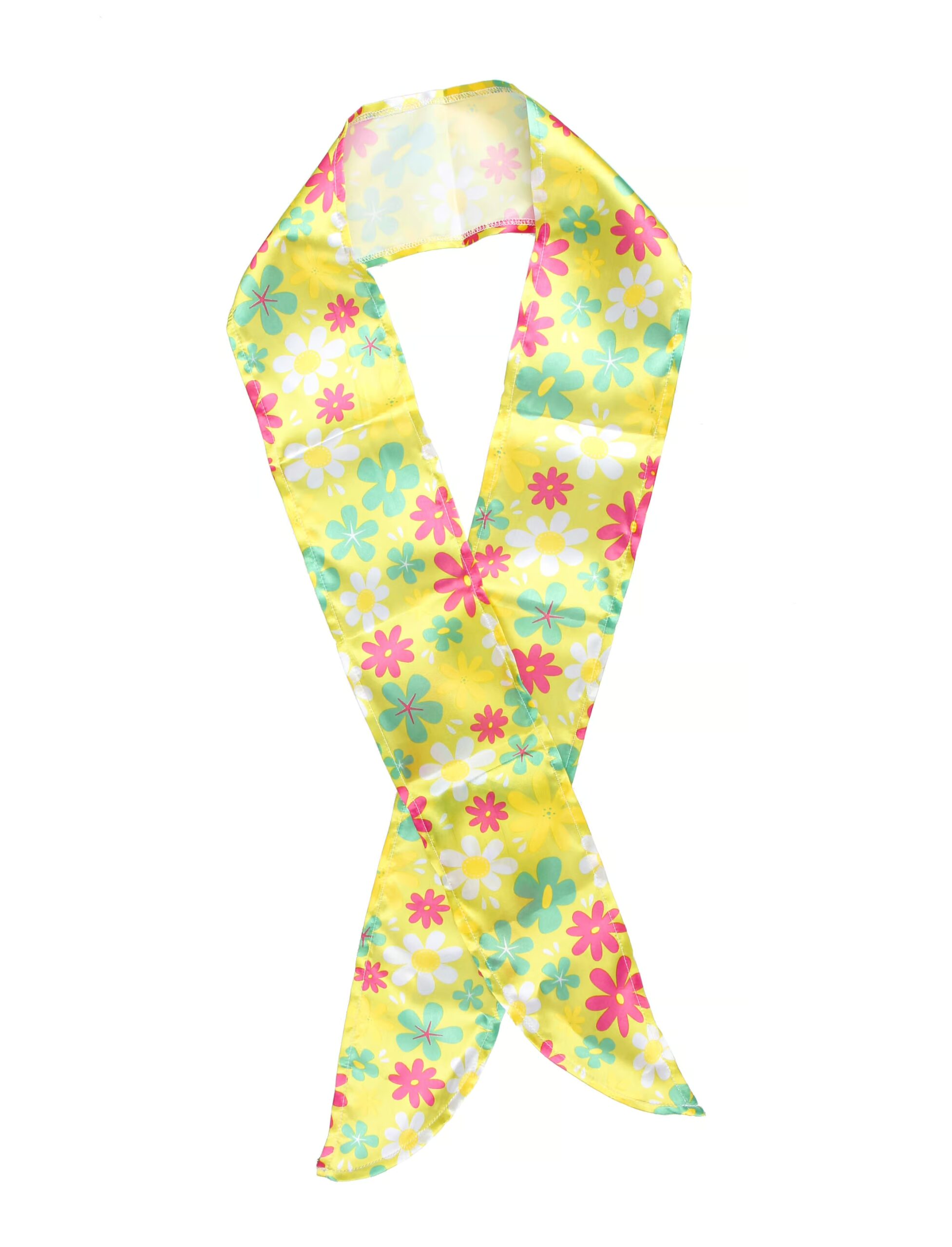 Schrill, bunt, blumig und so Hippie! Dieses gelbe Haarband mit den kleinen, bunten Blümchen ist ein Muss für alle Blumenmädchen und Hippies! Das Band einfach ins Haar binden und schon ist Dein 60er- / 70er-Jahre-Look perfekt!