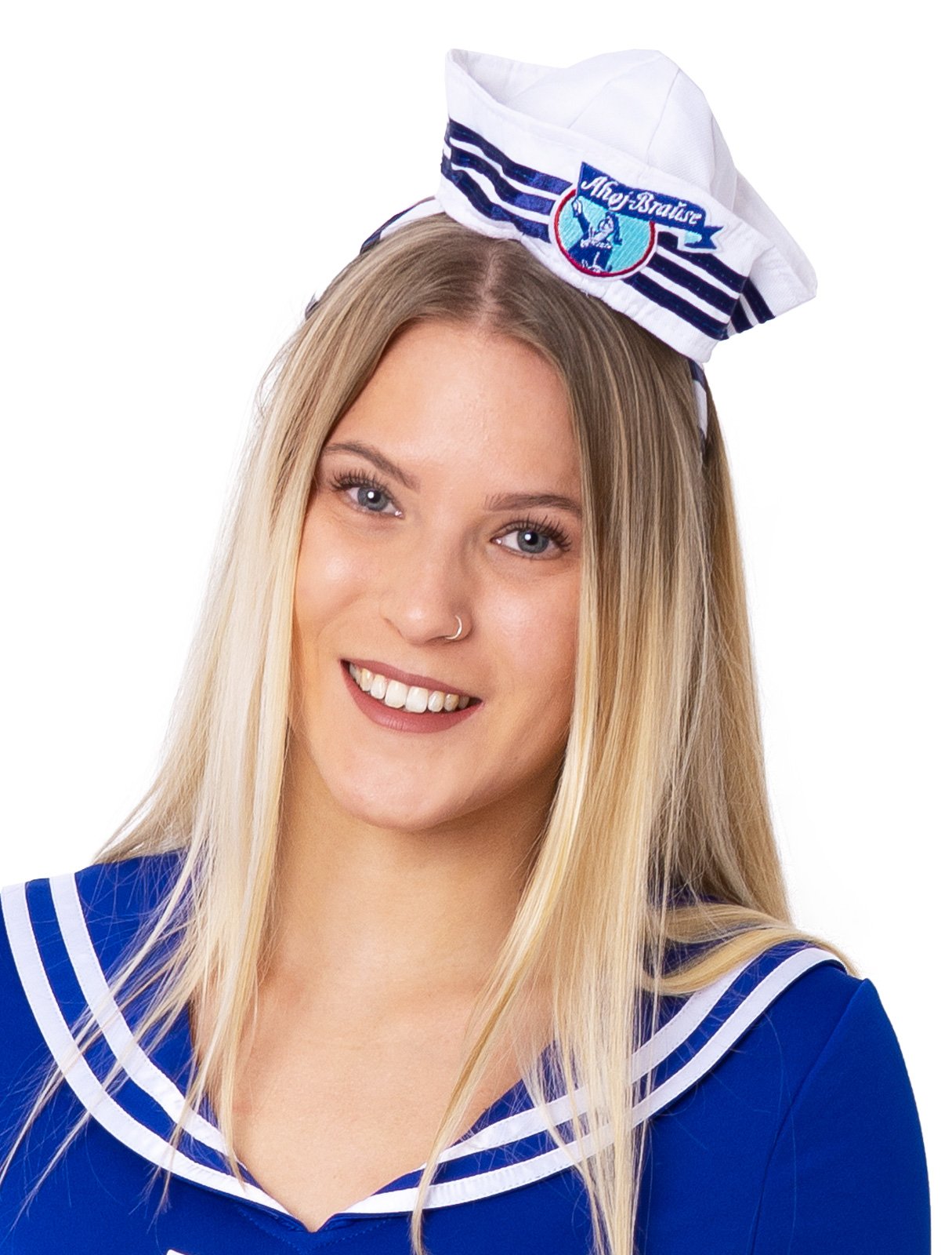 Frische Brise für den Kopf benötigt? Mit diesem coolen Ahoj-Brause Haarreif verleihst Du jedem Matrosen- oder Matrosinnen-Kostüm im Nu frischen Wind. Die weiße Kopfbedeckung mit den blau-weißen Streifen und dem charakteristischen Ahoj-Brause Aufnäher in der Front verleiht jedem marinen Kostüm das ganz besondere Etwas! Exklusiv bei uns. Offizieller Merchandise!