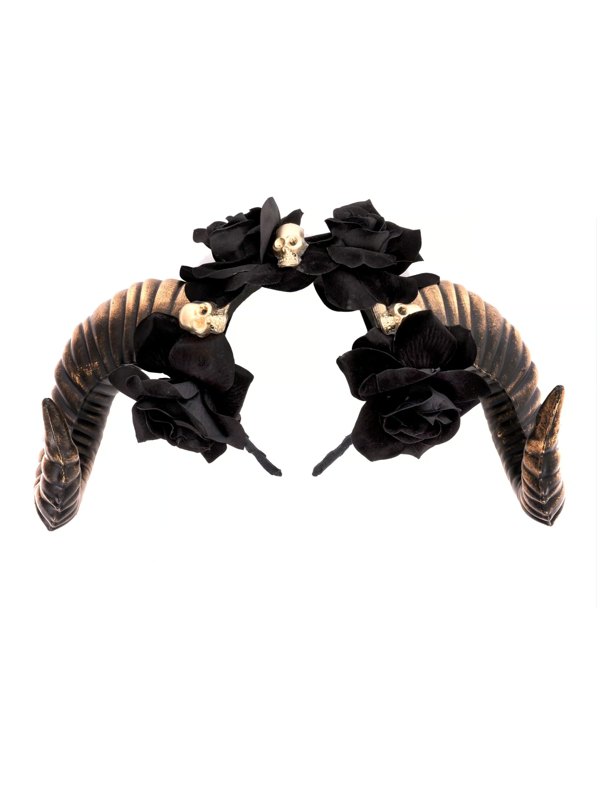 Du bist zu einer Halloweenparty eingeladen und suchst noch den letzten Schliff für Deine schaurige Verkleidung? Gar kein Problem! Dieser Haarreif mit goldenen Hörnern ist mit schwarzen Blumen sowie kleinen Totenköpfen verziert. Er macht Dein Kostüm komplett. Der Hörner haben jeweils eine Maße von 13 x 7 cm. Ein perfekter Kopfschmuck zu Halloween.