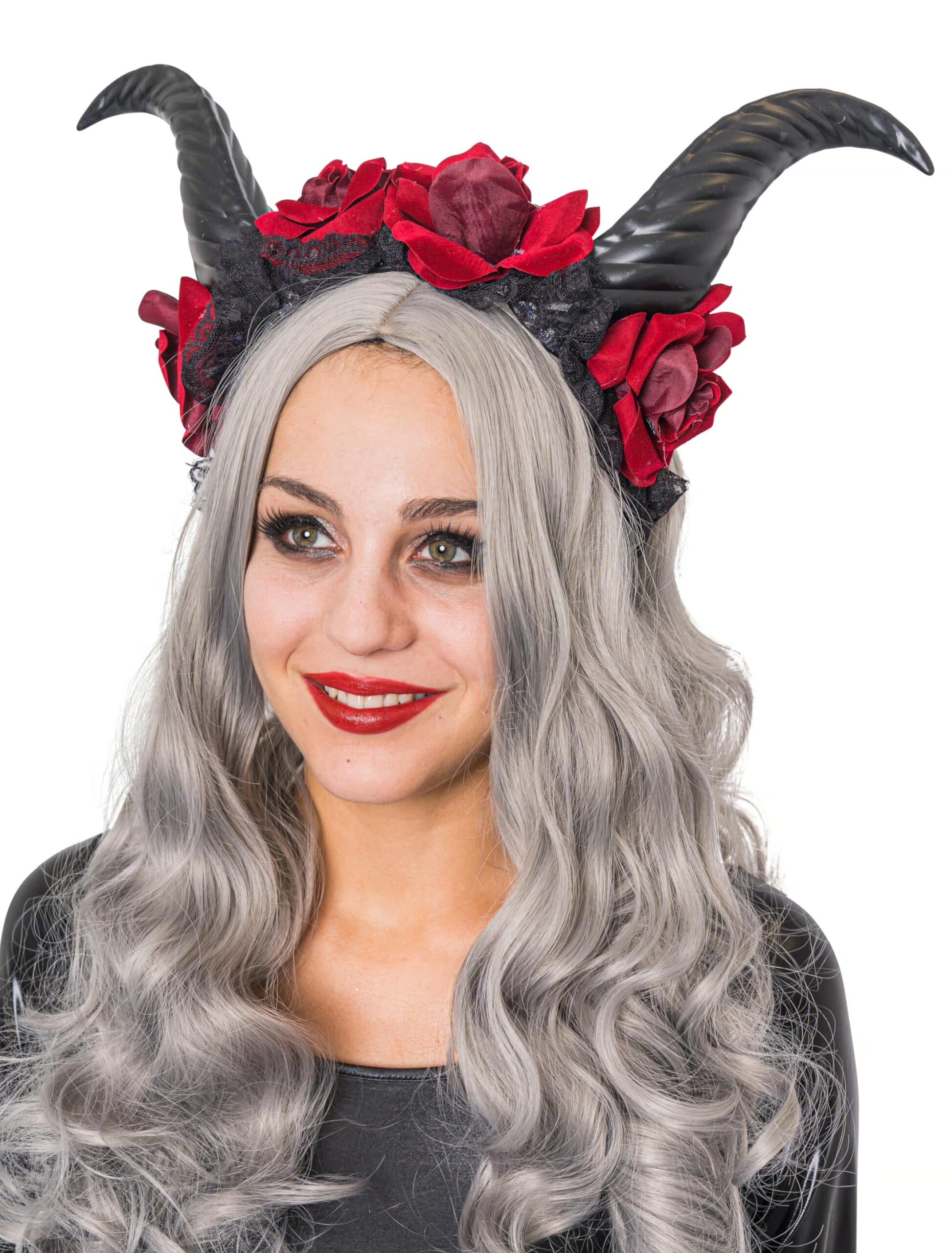 So schön kann es in der Unterwelt sein! Dieser außergewöhnliche Haarreif, der von zwei großen, schwarzen Hörnern, einer auffälligen Blütenpracht in Rot und edler, schwarzer Spitze geziert wird, ist das perfekte Accessoire für die kommende Halloween- oder Mottoparty. Bei diesem Anblick wird selbst der Teufel zum Romantiker!