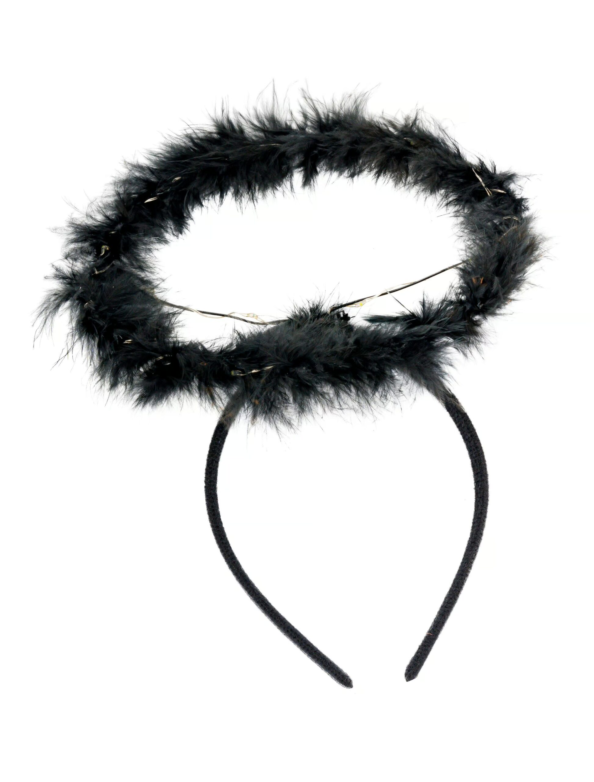 Du bist zu einer Halloweenparty eingeladen und suchst noch den letzten Schliff für Deine schaurige Verkleidung? Gar kein Problem! Dieser Haarreif Heiligenschein schwarz blinkend ist ein echter Hingucker. Der Heiligenschein hat einen Durchmesser von 17 cm. Die Besonderheit bei diesem Heiligenschein ist, dass er per Knopfdruck leuchtet und blinkt. Hier sind Batterien enthalten. Ein perfekter Kopfschmuck als schwarzer Engel zu Halloween.