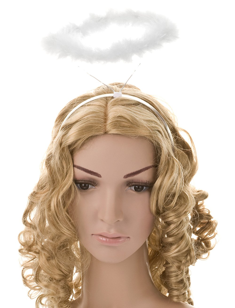 Mit dem Heiligenschein Haarreif in Weiß wird Dein Engelskostüm mit dem passenden Schein gekrönt. Auf dem Haarreif ist der Heiligenschein mit einem Draht befestigt und mit weißen Federn geschmückt. Das verleiht nicht nur dem Kopfschmuck sondern auch Deinem ganzen Kostüm die nötige Leichtigkeit.