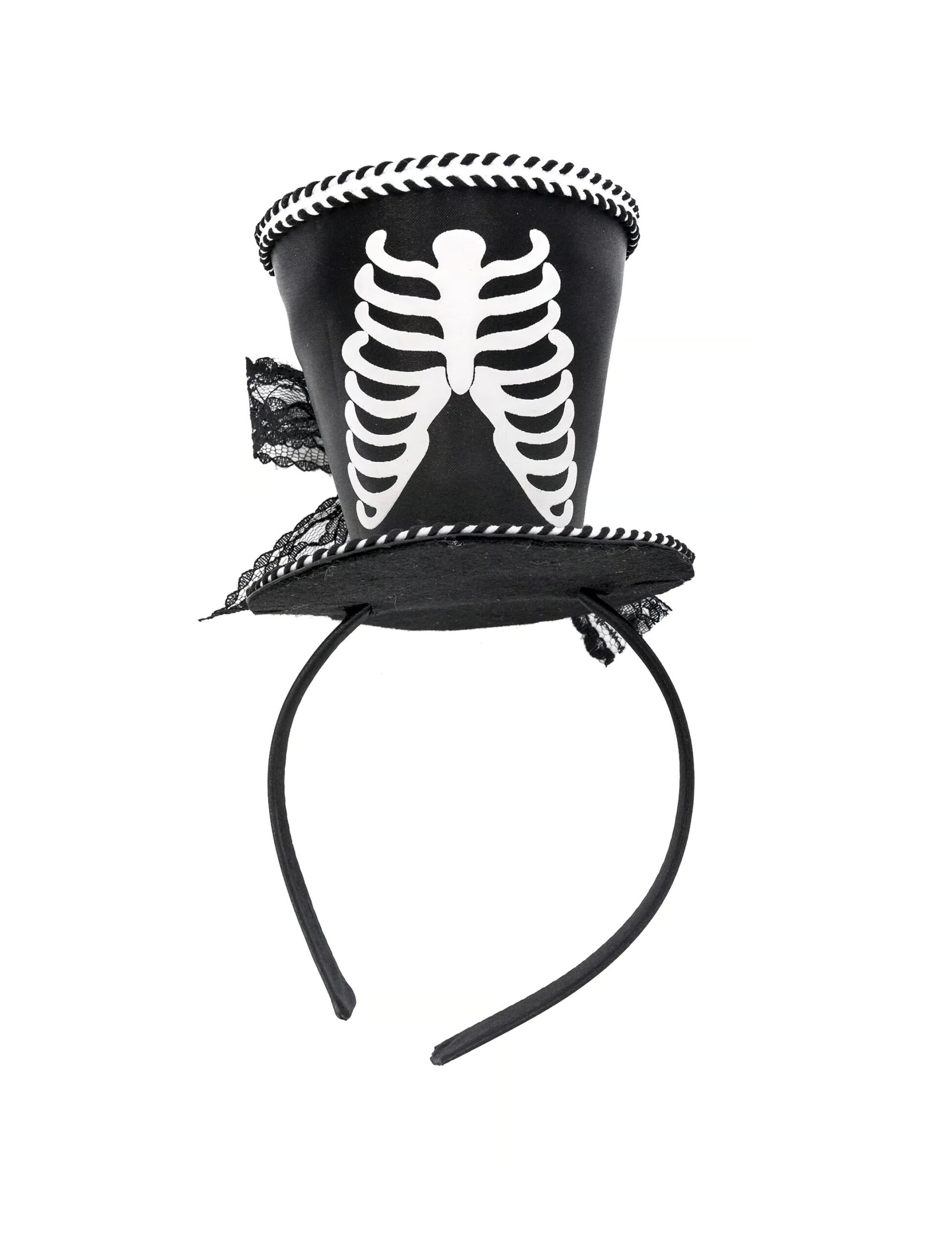 Der schwarze Haarreif mit Mini Zylinder und einer Abbildung eines weißen Skelett-Brustkorbes darauf, ist ein echter Hingucker, der die Blicke der Gäste bei Partys oder anderen Veranstaltungen aller Art auf Dich ziehen wird. Der aus 100% Polyester bestehende Haarreif hat einen Durchmesser von 13 cm und ist 10 cm hoch. Ein schicker Kopfschmuck für Dein schauriges Kostüm an Halloween.