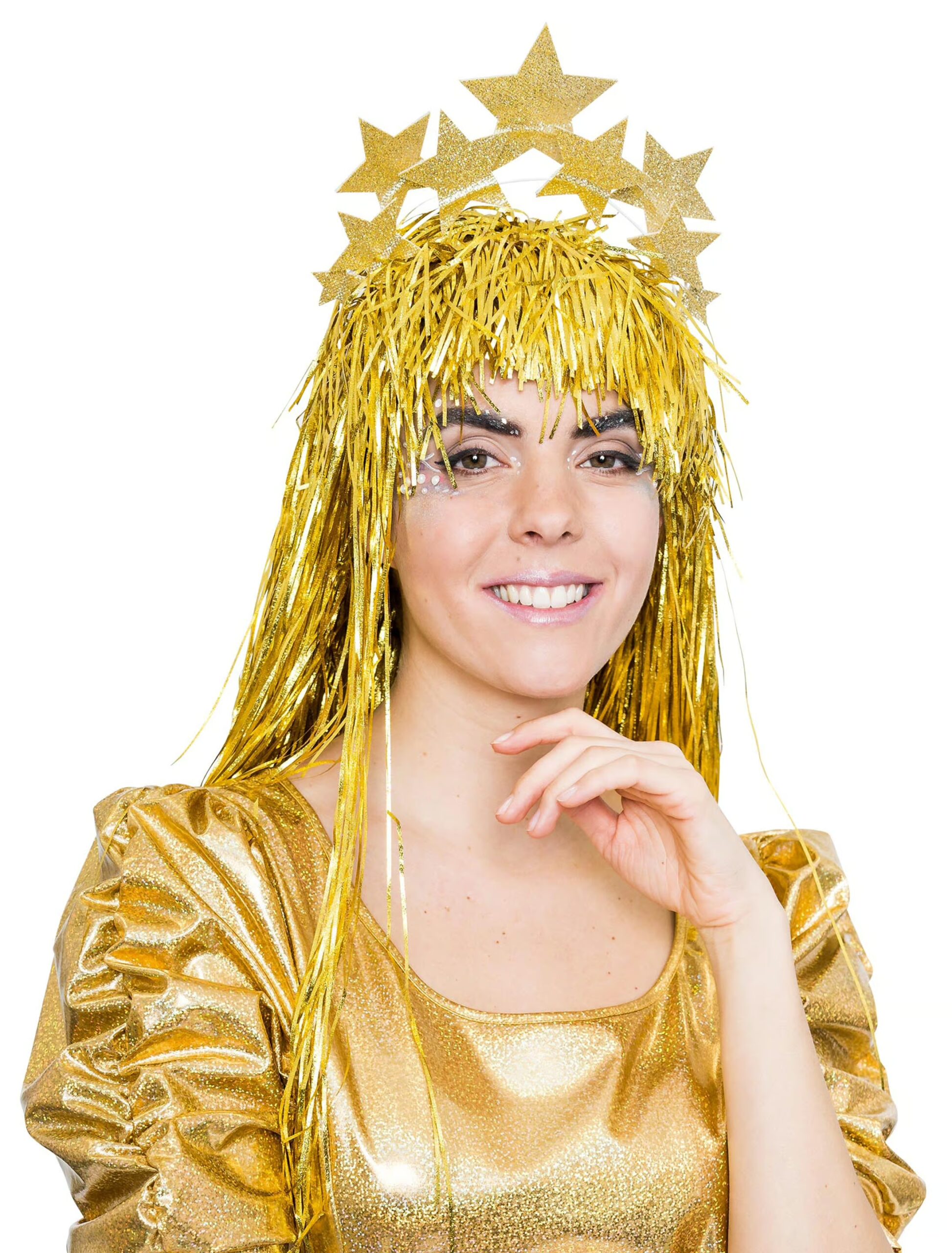 Zauberhaft und wunderschön zugleich ist der stylische Haarreif mit Sternen, den Du im goldenen Design bei uns im Shop bestellen kannst. Der attraktive Kopfschmuck für die Königin der Nacht besteht aus mehreren hübschen Sternen, die aus Polyester gefertigt sind. Traumhaft glitzern die verschieden großen Himmelskörper bei Lichteinfall und sorgen dafür, dass alle Blicke beim Feiern auf Dich gerichtet sind.