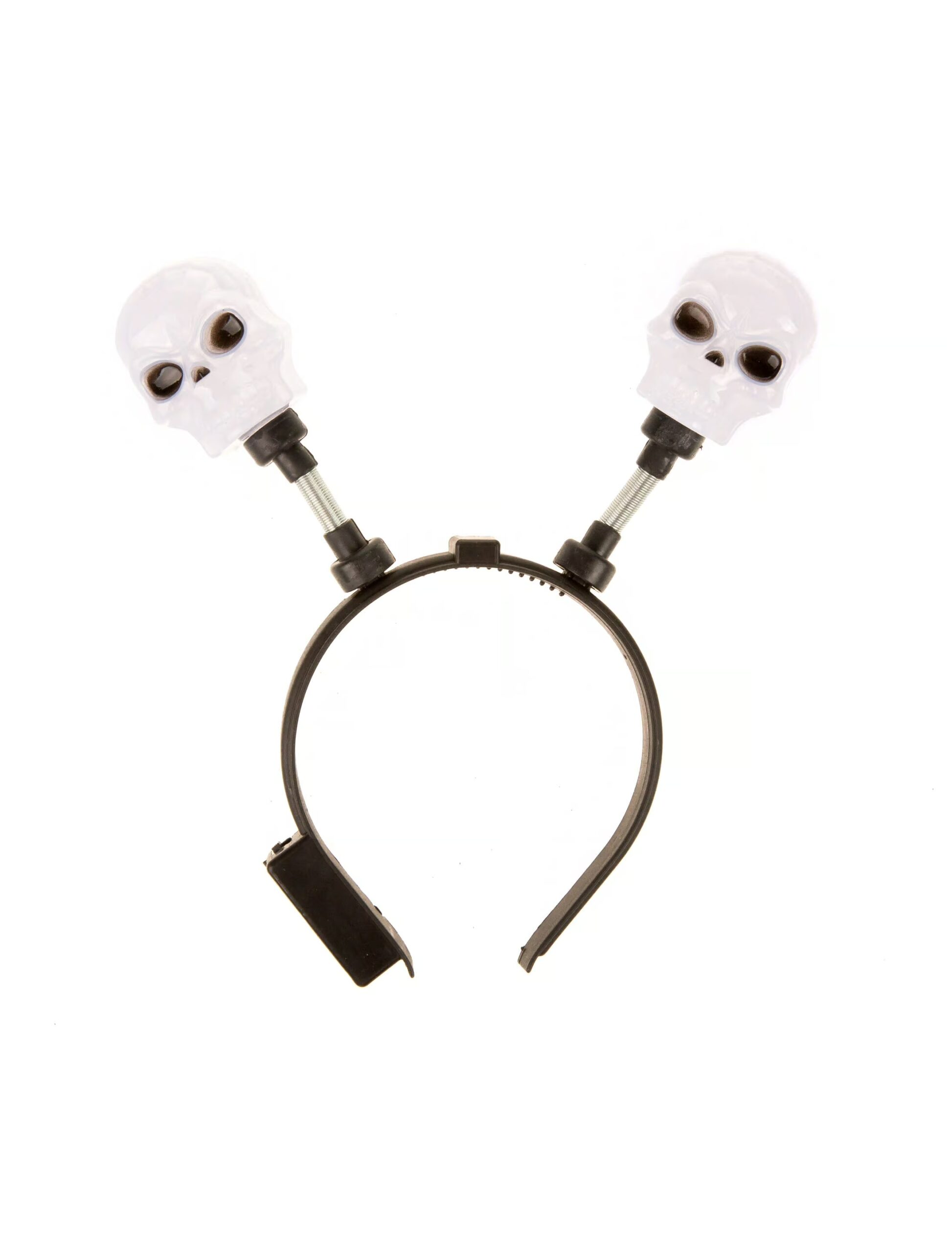 Dieser Haarreif mit Totenköpfen ist genau die richtige Kopfbedeckung für Dein grauenvolles Halloween-Outfit! Die beiden Totenschädel sind aus Kunststoff gefertigt und wackeln dank der Metallfedern lustig hin und her. Eingebaute LED-Leuchten mit Farbwechsler sorgen für bunte Beleuchtung!
