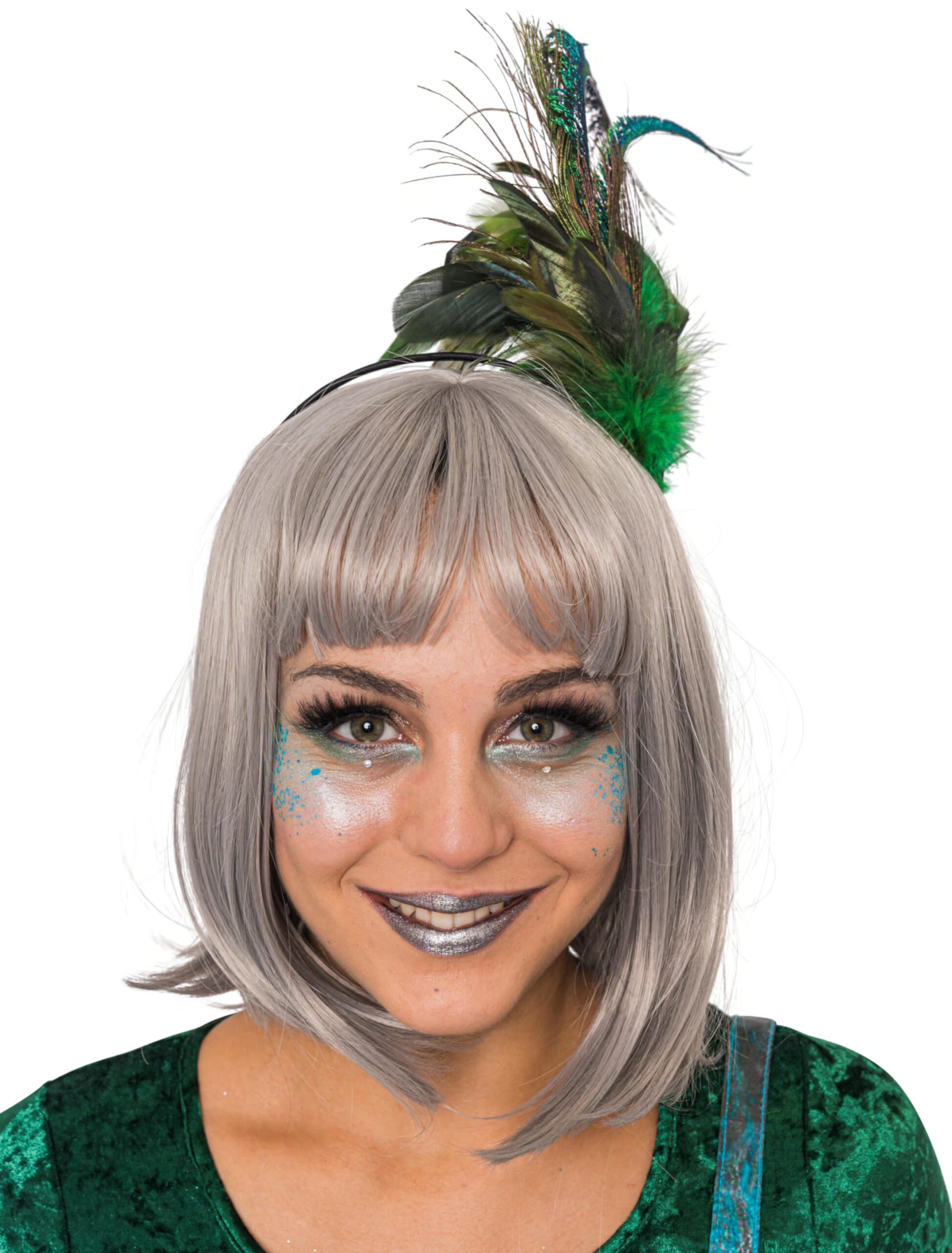Glamourös und edel, so zeigt sich der Haarreif mit Pfauenfeder. Ob als Ergänzung für Deinen Pfauen-, Charleston-Look oder zur Faschingsparty – dieser Kopfschmuck ist ein absoluter Hingucker und ziert jede Frisur oder auch Perücke. Die langlebigen Federn und der stabile Haarreif ermöglichen eine mehrfache Nutzung, so dass Du es immer wieder mit anderer Kleidung kombinieren kannst.