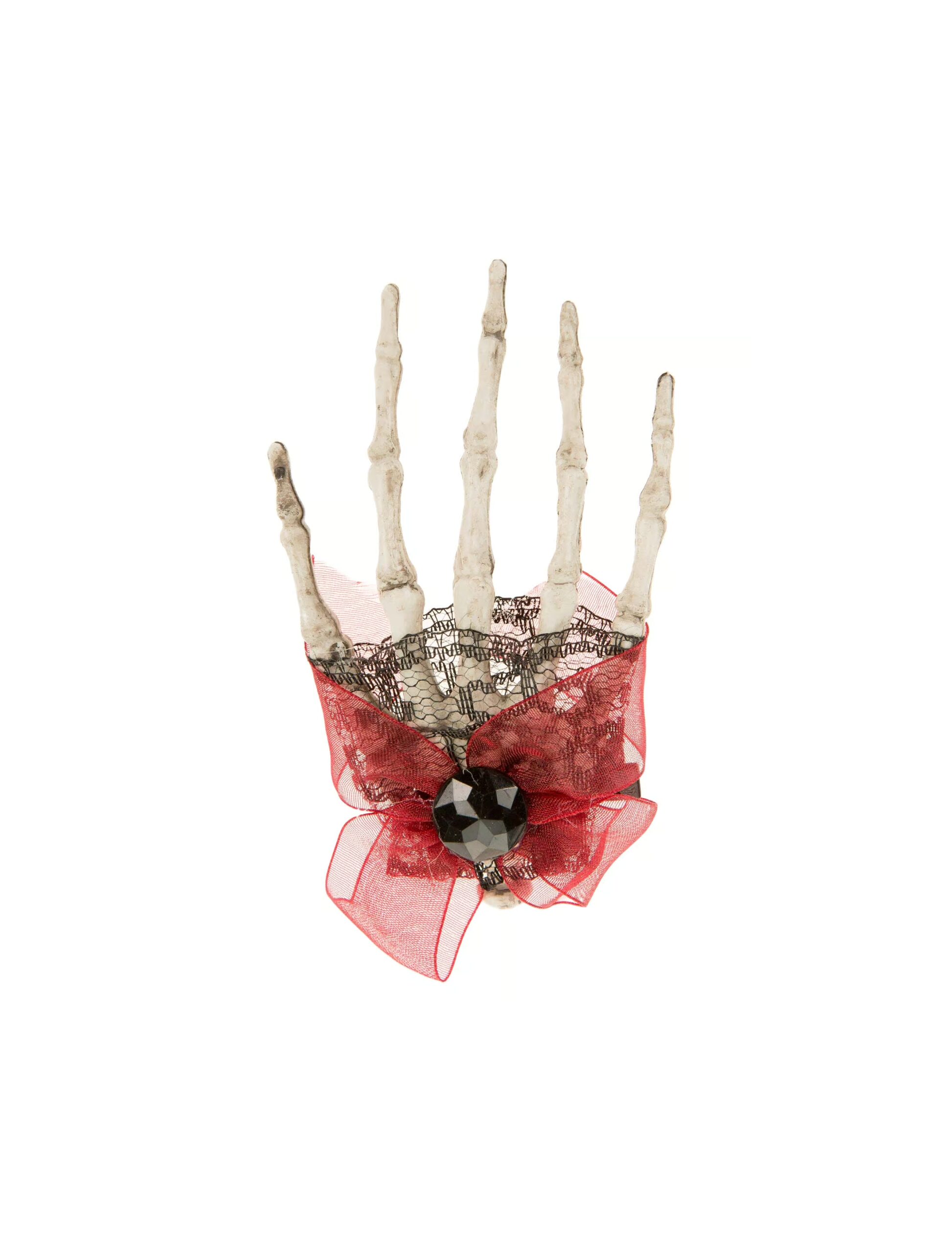 Diese gruselige, knochige Hand (ca.10×6,5cm) ist eine schaurig-schöne Ergänzung für Dein Halloween-Outfit! Sie wird einfach mit einer Haarspange an Deinen Haaren befestigt. Die schwarze Spitze ist mit einer Schleife und einem funkelnden Stein verziert und lässt die Skeletthand schon fast elegant aussehen. Perfekt für alle Gothic-Ladies, Hexen und andere finstere Gestalten!