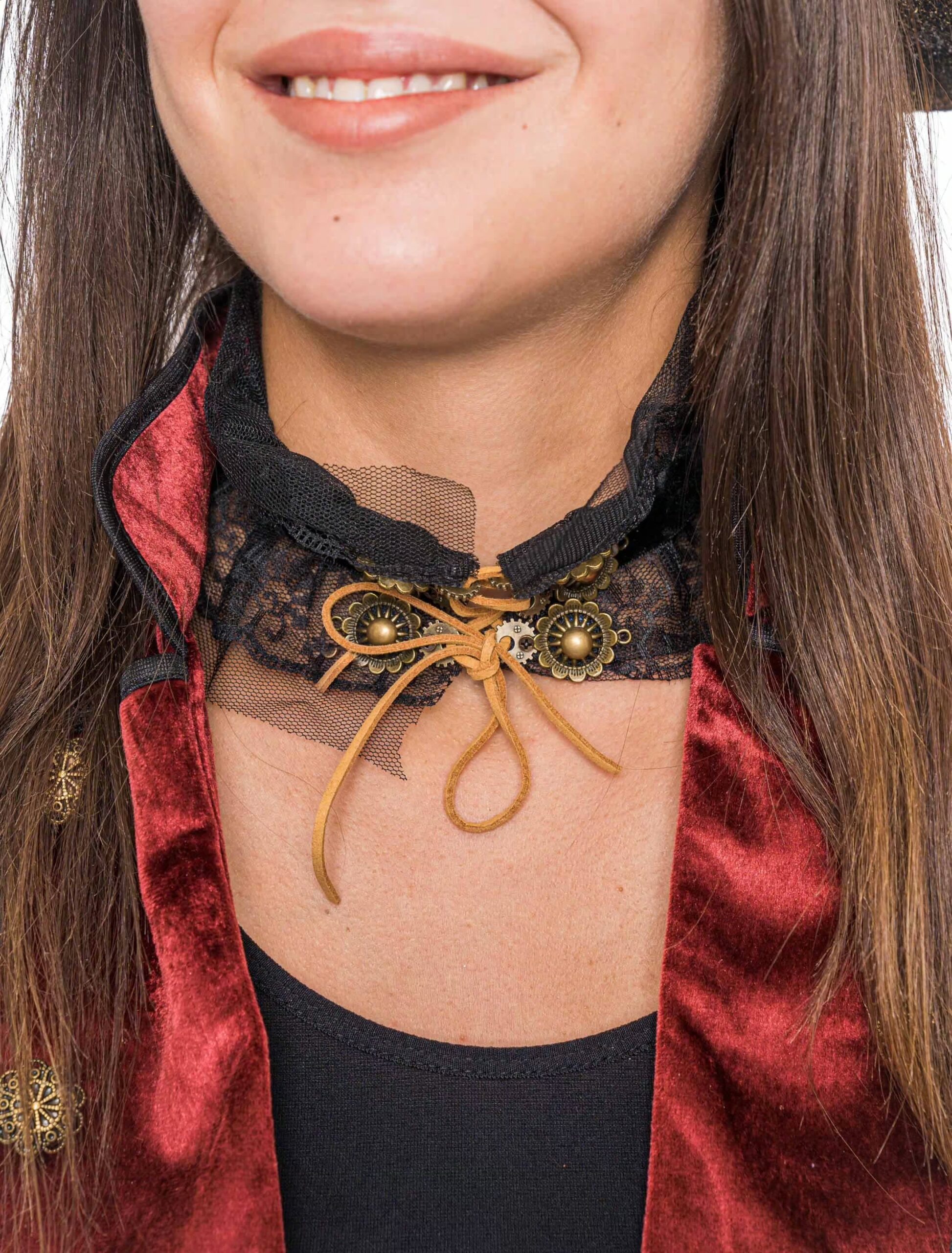 Mit diesem wunderschönen Halsband kannst Du Dein Kostüm exklusiv vervollständigen. Es ist mit besonderen Verzierungen aus schwarzen, feinen Nähten auf einem zarten Stoff gestickt. Highlight sind die hellbraunen Bänder, die Du vorne zusammen schnüren kannst. Hinten kann das Halsband mit einem kleinen Karabiner geschlossen werden. Dieses Accessoire musst Du als Vampir oder Dame aus den 80ern zu Halloween unbedingt anziehen.