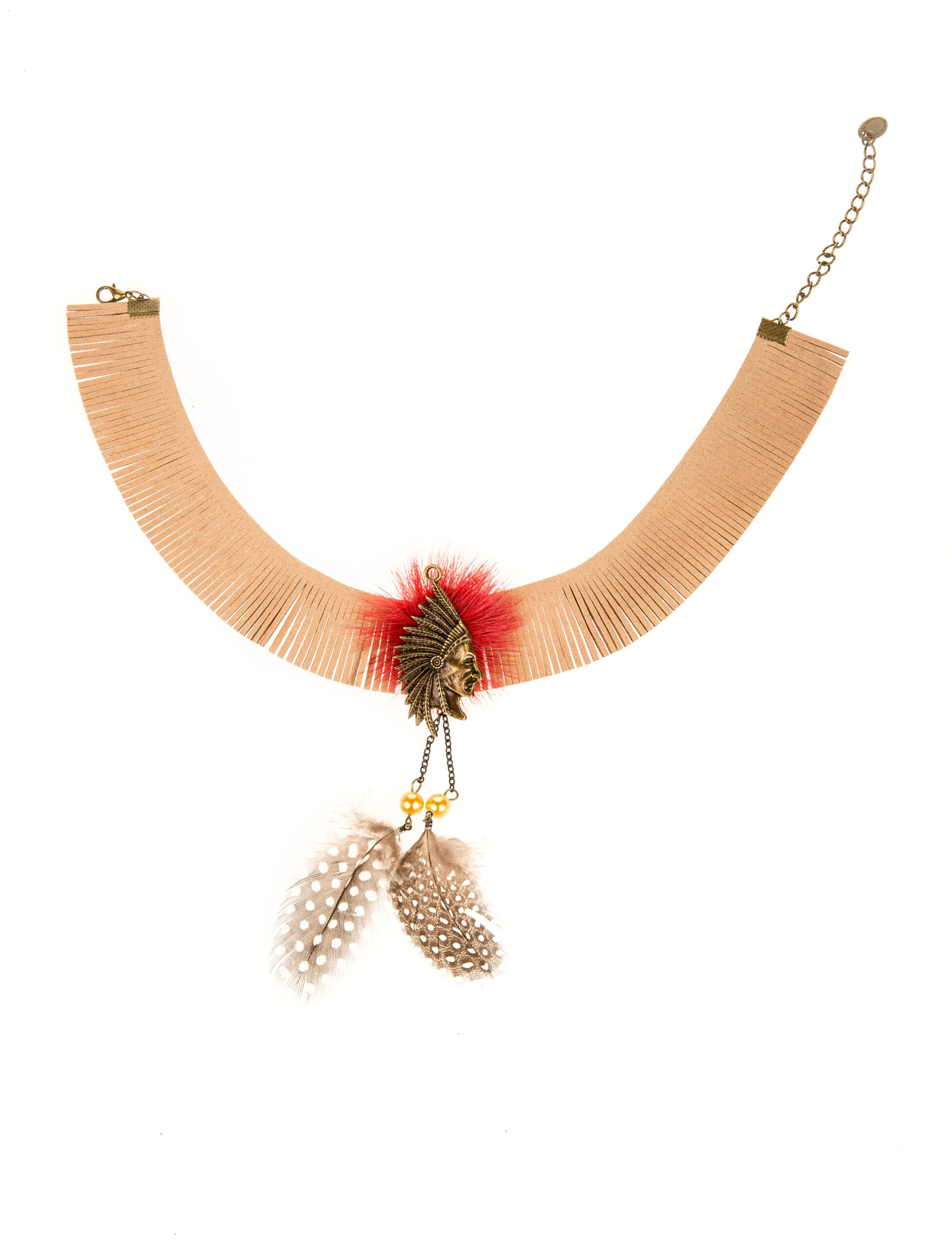 Diese Halskette ist eine besonders schöne Ergänzung für Dein Indianer-Outfit! Das breite Halsband ist aus Kunstleder gefertigt und mit einem metallischen Häuptling-Amulett geschmückt. Echte Federn runden den natürlichen Look auf kunstvolle Art und Weise ab. Howgh!