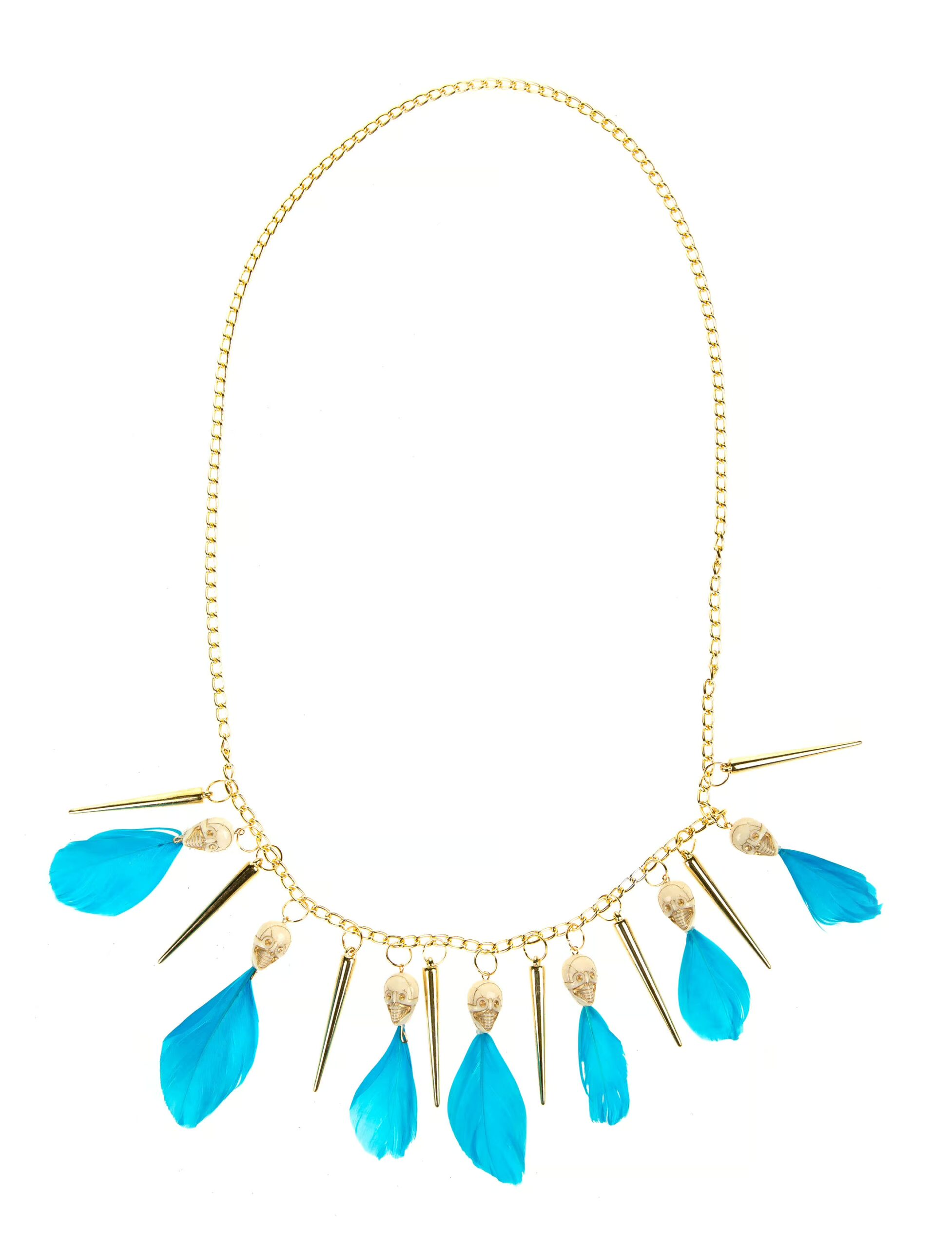 Feminines Accessoire, dessen dunkle Seite erst beim näheren Betrachten zum Vorschein kommt! Die goldfarbene Halskette ist mit sieben Mini-Totenköpfen verziert, welche wiederum von hübschen, türkisfarbenen Federn geschmückt werden. Zwischen den Skulls befinden sich goldfarbene Applikationen, die aussehen wie kleine Dolche. Ein perfektes Schmuckstück für Voodoo-Priesterinnen!