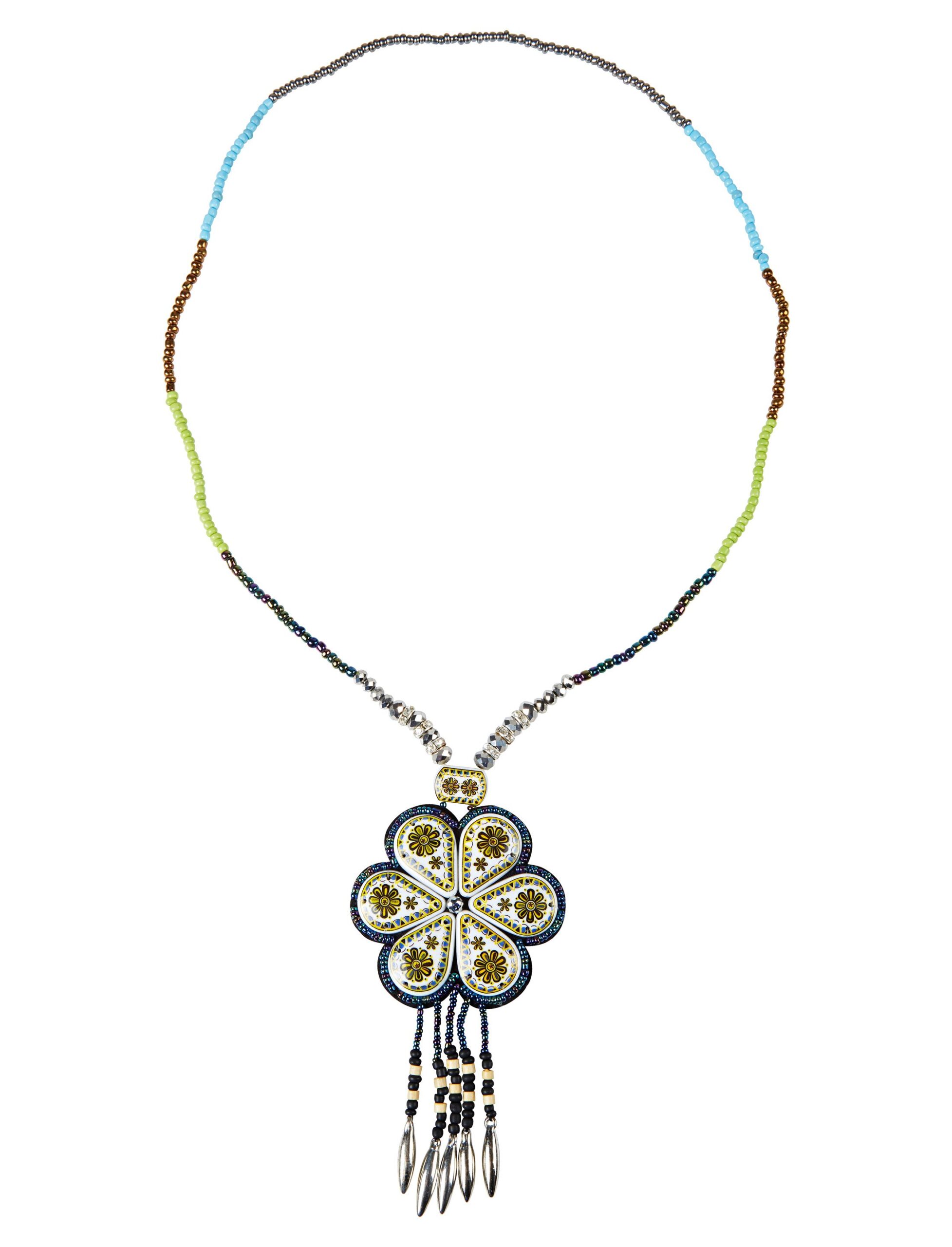 Genau die richtige Ergänzung zu Deinem Flower-Power-, Hippie- oder Indianer Outfit! Diese Halskette mit mehrfarbigen Perlen sowie einer großen schön dekorierten Blume als Anhänger ist ein echter Hingucker. Die ideale Halskette zu Deinem Kostüm für die nächste Karnevals-, Faschings- oder Schlager-Party!