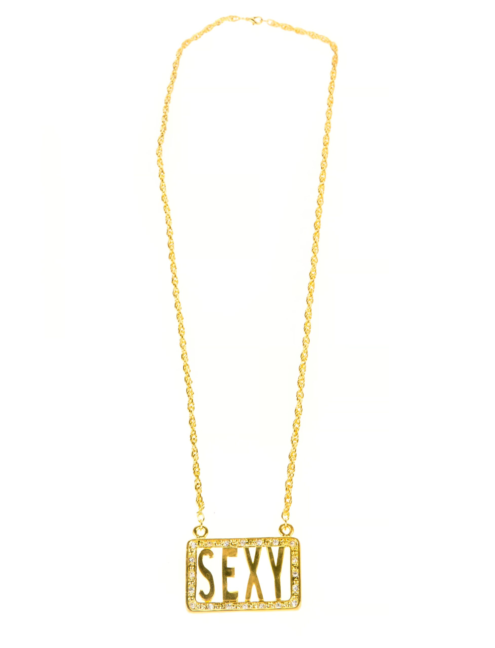 Mit dieser protzigen Halskette zeigst Du jedem, wie unglaublich sexy Du bist! Die goldene Kette ist aus Metall gefertigt und mit einem fetten SEXY-Schriftzug als Anhänger versehen. Genau das richtige Accessoire für Dein dekadentes Outfit als Partyqueen, Rapper oder Asi-Braut!
