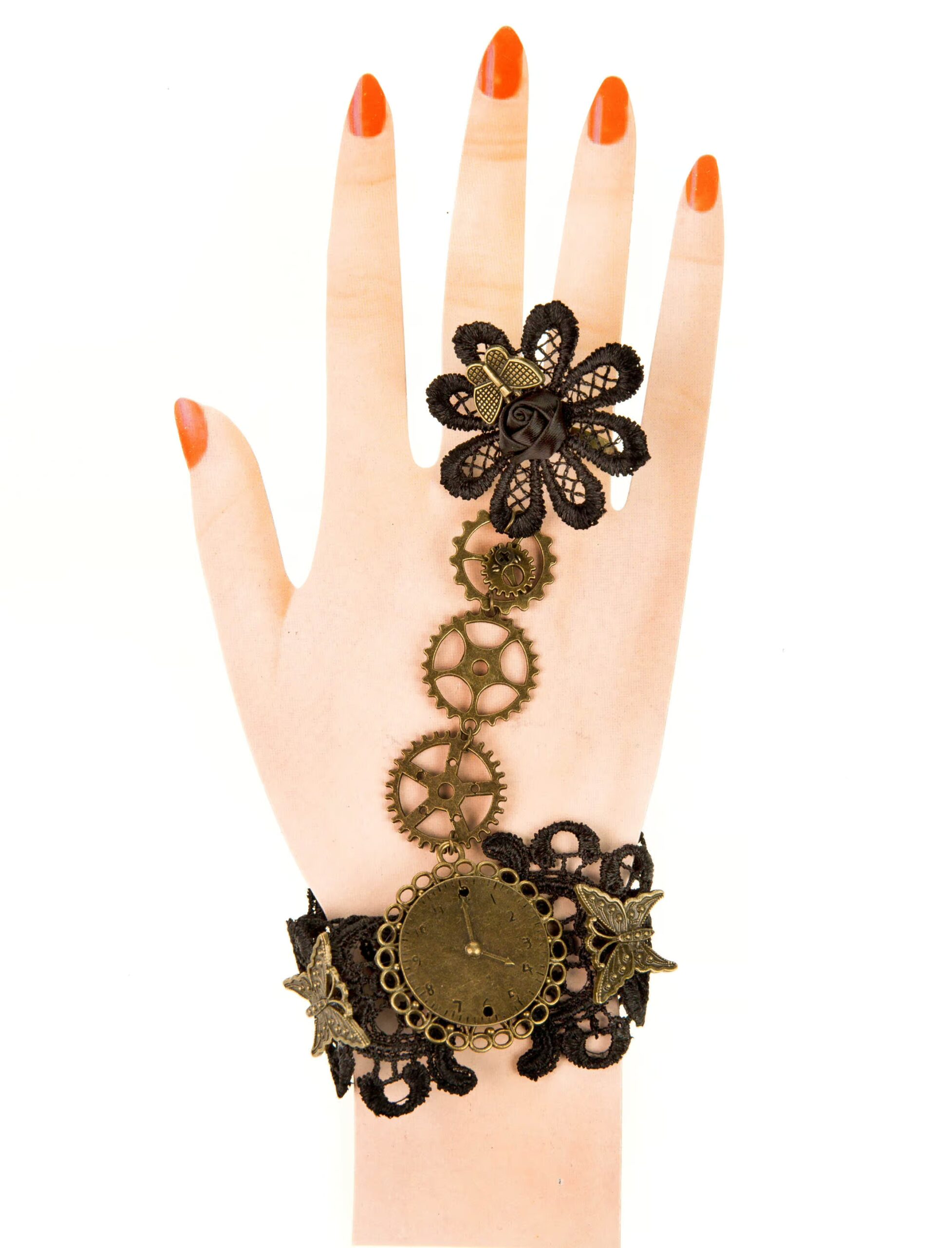 Diese extravagante Handkette ist ein besonders hübsches Accessoire für Dein Kostüm! Die kreative Kombination aus Schmetterlingen, Zahnrädern, Ziffernblatt und Blütenring ist ein echter Hingucker und verleiht Deinem Steampunk- oder Gothic-Outfit das gewisse Etwas. Genau das richtige Schmuckstück – egal ob an Karneval oder Halloween!