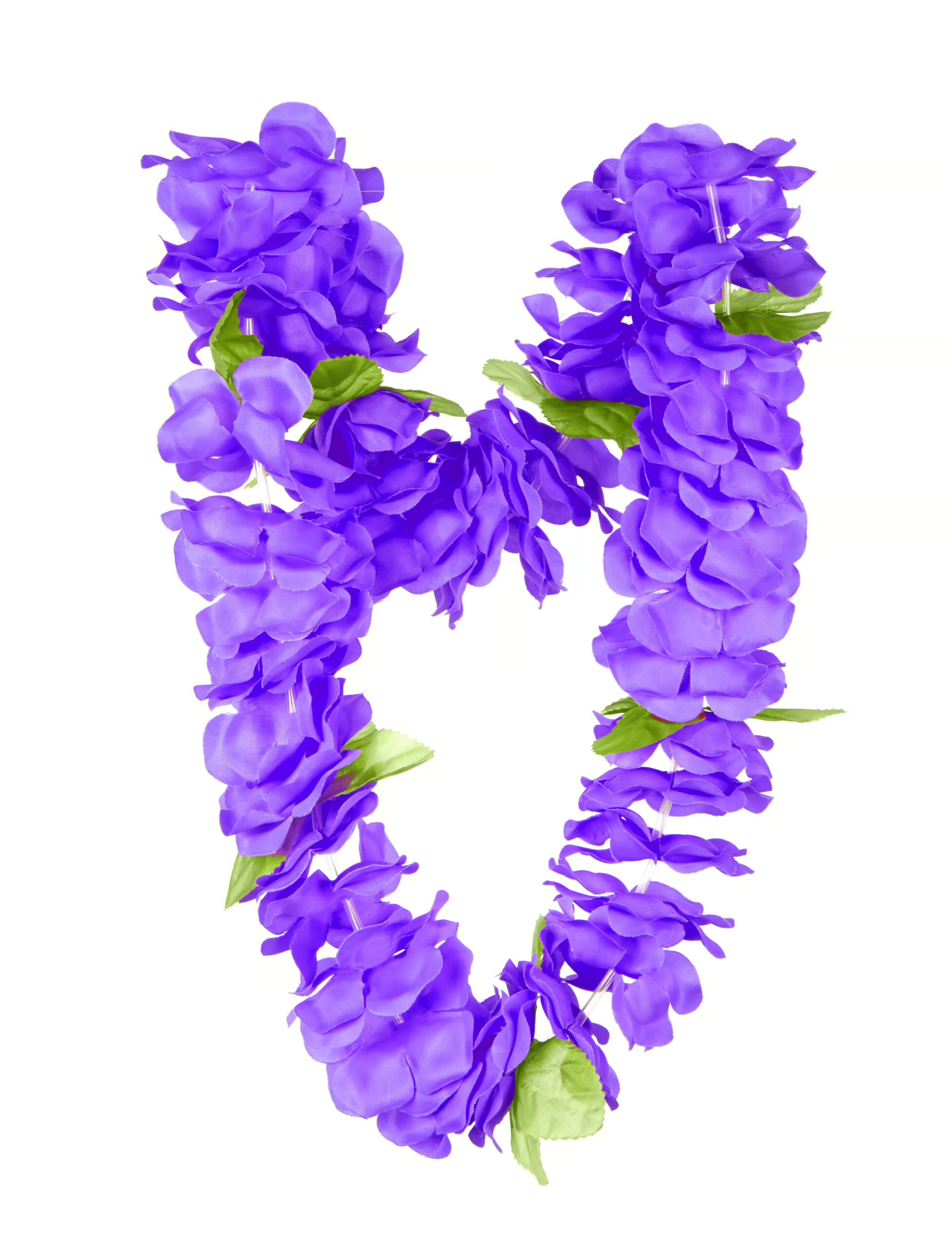 Aloha! Mit dieser prächtigen Blumenkette, auf Hawaii auch Lei genannt, tanzt sich der Hula doch gleich viel besser! Die Halskette ist mit lila Polyester-Blüten sowie grünen Blättern verziert und sorgt für Hawaii-Feeling und Flower-Power pur. Der perfekte Schmuck für Dein authentisches Insel-Outfit!