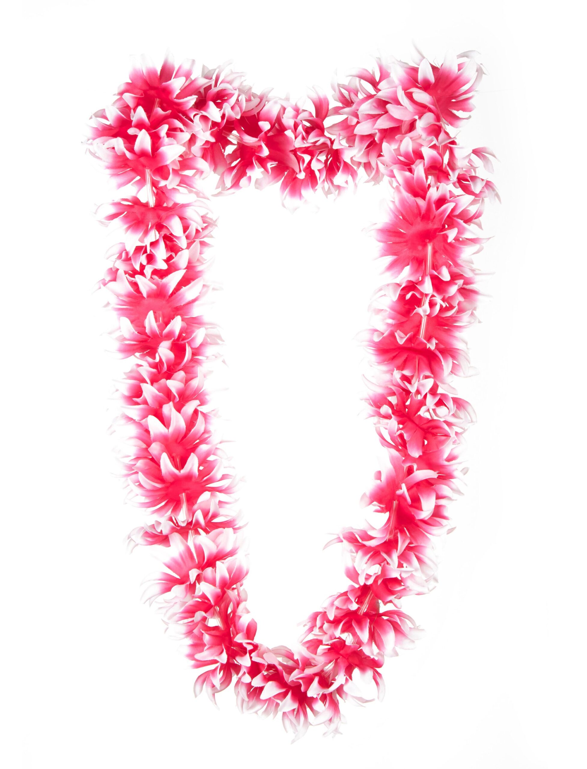 Aloha! Mit dieser prächtigen Blumenkette, auf Hawaii auch Lei genannt, tanzt sich der Hula doch gleich viel besser! Die Halskette ist mit pink-weißen Polyester-Blüten verziert und sorgt für Hawaii-Feeling und Flower-Power pur. Der perfekte Schmuck für Dein authentisches Insel-Outfit!