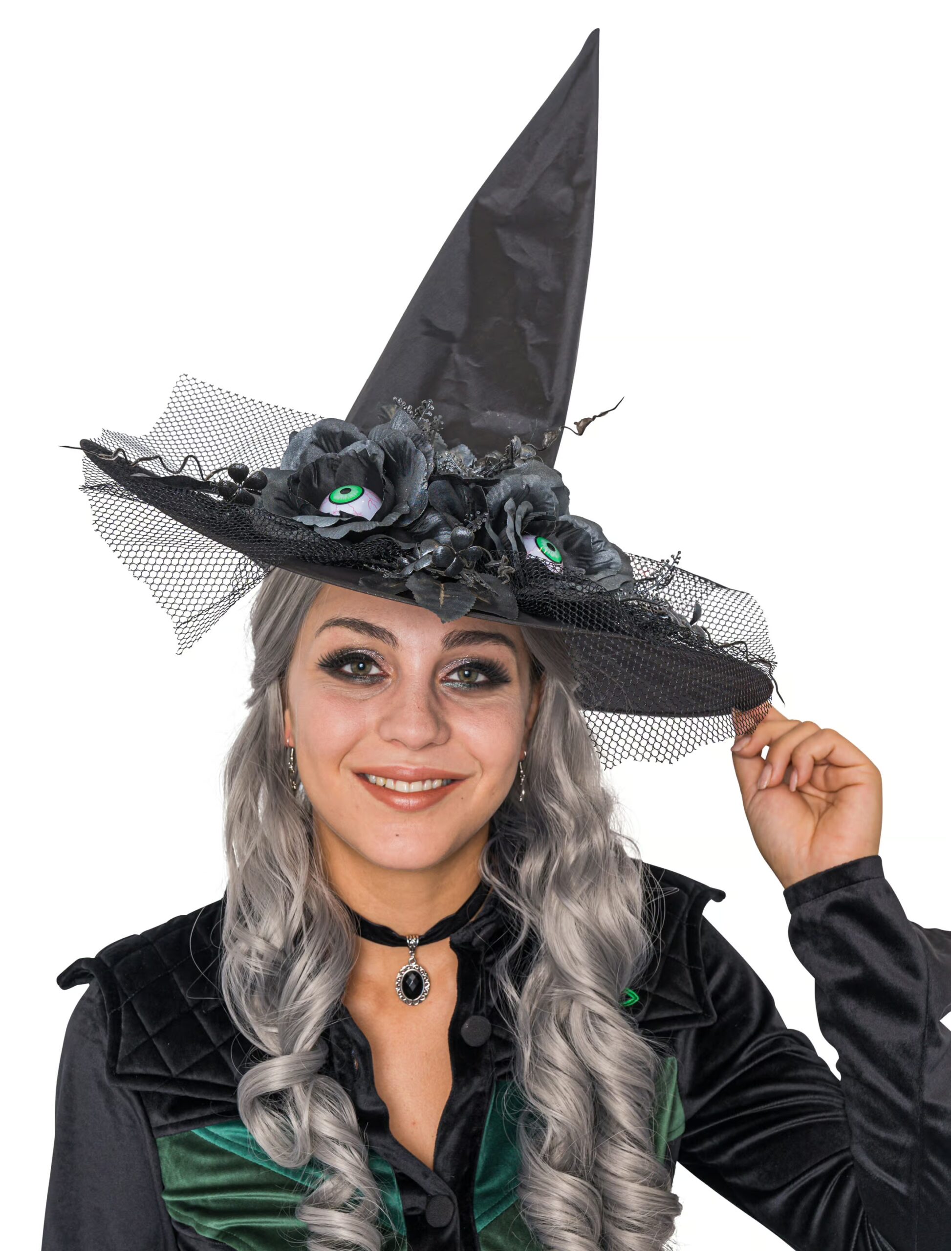 Die etwas andere Kopfbedeckung: Dieser Hexenhut ist nicht nur ein sehr hübscher schwarzer Hut mit netten Blumen, sondern birgt so seine Überraschungen. Schocke Deine Gesprächspartner damit, dass sie plötzlich von zwei grünen Glubschaugen angestarrt und fixiert werden. Die Aufmerksamkeit auf jeder Party ist Dir garantiert, und bei den nächtlichen Streifzügen an Halloween wird Dir dank des zusätzlichen Augenpaars auch nichts entgehen.