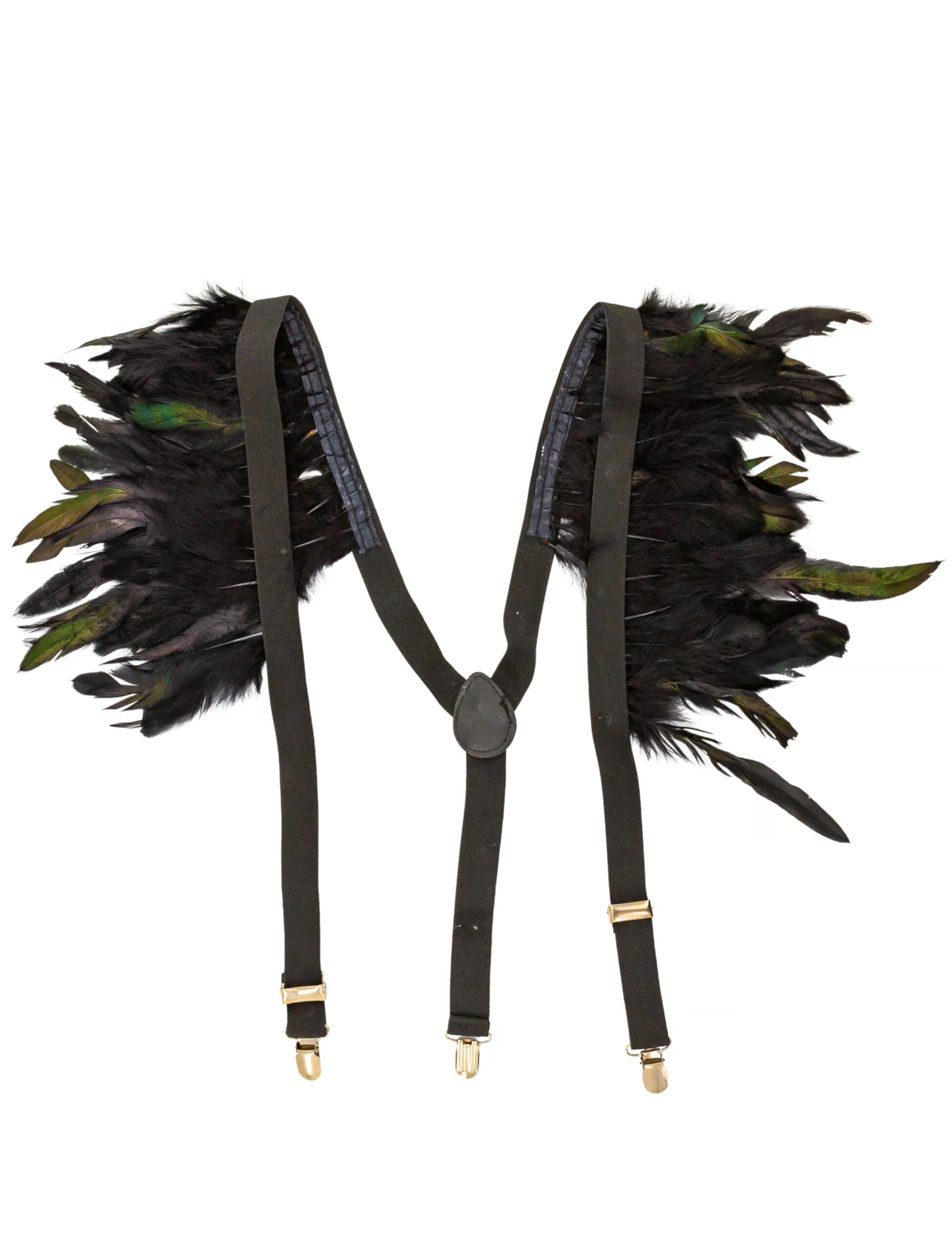 Diese ausgefallenen Hosenträger sind nicht nur extrem praktisch, sie sind auch ein echter Hingucker zu zahlreichen Karnevals- und Halloween-Kostümen. Die schwarzen Träger lassen sich in der Front bequem durch zwei Clips und auf der Rückseite durch einen Clip an einer Hose oder einem Rock anbringen. Im oberen Bereich sind die schmalen Träger mit hübschen, schwarzen Federn verziert, die perfekt zu düsteren Raben- oder Gothic-Kostümen passen.