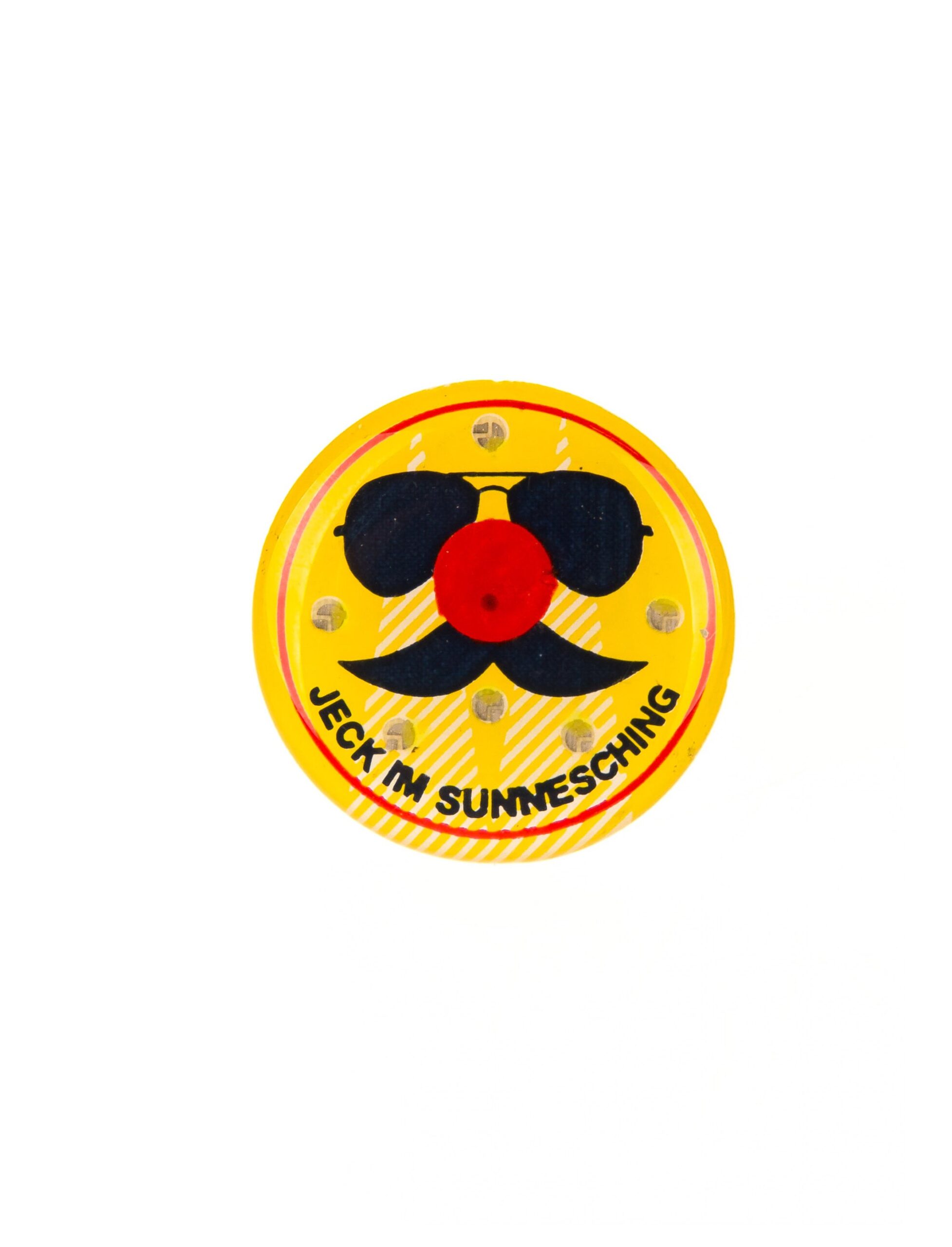 Dein treuer Begleiter für die größte Sommersause, die ganz im Motto Jeck im Sunnesching†steht! Der coole Blinky lässt sich bequem an jedes Kleidungsstück pinnen und blinkt durch die sechs integrierten Blinklichter fröhlich vor sich hin. Verziert ist er mit dem lustigen Sunnesching-Gesicht (Sonnenbrille, Pappnase, Schnäuzer) auf gelbem Hintergrund. Ein tolles Accessoire, das mit der Sonne um die Wette strahlt! Knopfzellen-Batterie inkl.