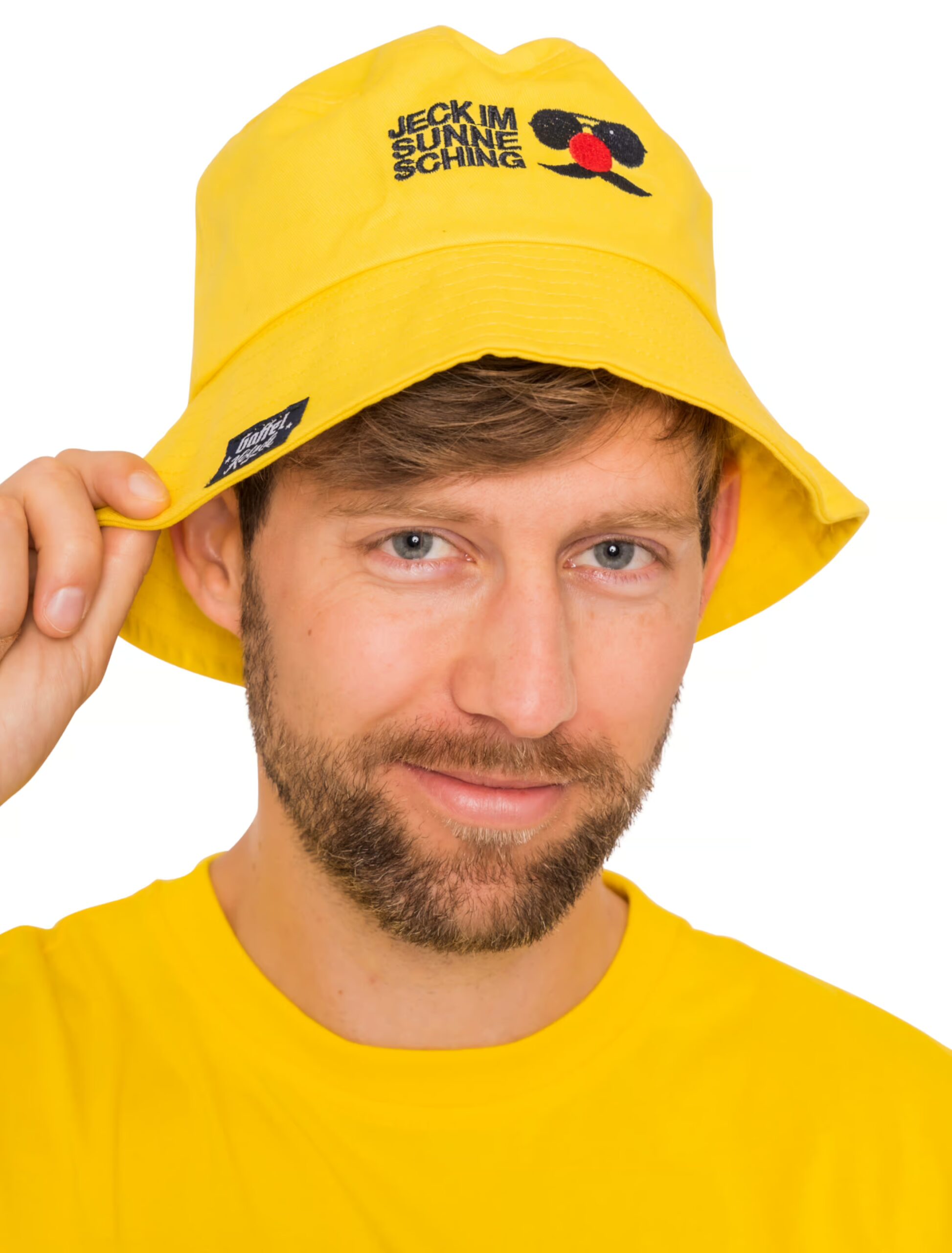 Ja, den gibt es jetzt auch! Dieser strahlend gelbe Original Jeck im Sunnesching Fischerhut schützt Dich nicht nur vor einem Sonnenbrand, sondern macht auch richtig etwas her. Der Fischerhut besteht aus reiner Baumwolle. In der Front ist der trendige Fischerhut mit der Aufschrift JECK IM SUNNESCHING und dem lustigen Logo mit Brille, roter Nase und Schnörres verziert. Ideal für die nächsten Gartenpartys geeignet, um Dich beim Grillen vor der Sonne zu schützen!