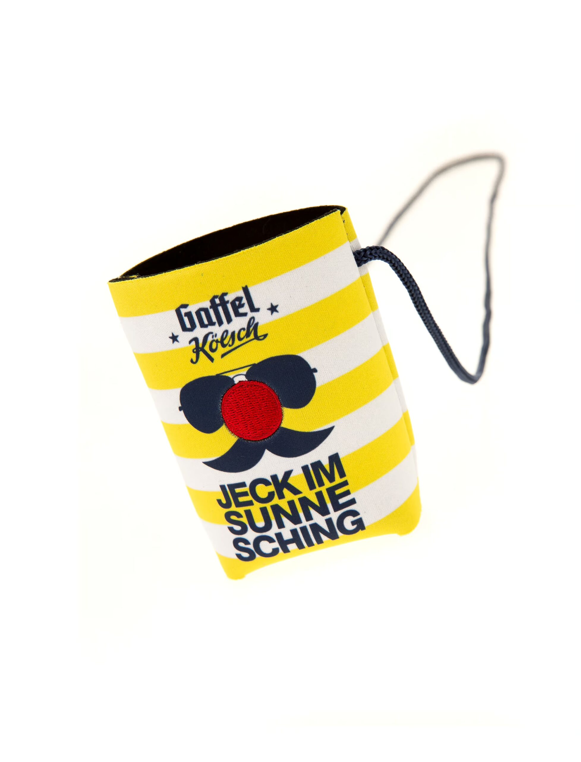 Hier fühlt sich jedes Kölsch wohl! Dieser Jeck im Sunnesching-Kölschglashalter mit weißen und knallgelben Streifen verziert sowie dem Gesicht des Sommerkarnevals (Sonnenbrille, rote Pappnase, Schnäuzer) ist er ein toller (und vor allem praktischer) Begleiter für jede Outdoor Party. Besonders clever: Durch eine Kordel kannst Du den Kölschglashalter bequem um Deinen Hals tragen! Höhe: ca. 10cm – Auch für 0,33l-Flaschen (bspw. Gaffels Fassbrause, Kölsch, etc.) geeignet.